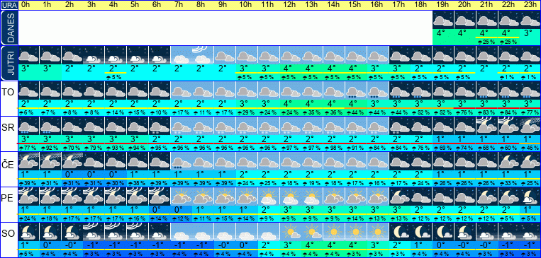 | Temperatura: | 0°C / 1°C / 2°C (+-2°C) | Možnost padavin: | 49 % | Hitrost vetra: | 4 / 6 / 7 km/h (+-4) | Skupna oblačnost: | 81 / 92 / 100 % (+-4) |