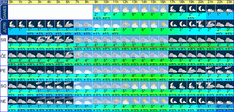 | Ura | 00h | 01h | 02h | 03h | 04h | 05h | 06h | 07h | 08h | 09h | 10h | 11h | 12h | 13h | 14h | 15h | 16h | 17h | 18h | 19h | 20h | 21h | 22h | 23h | |  |  |  |  |  |  |  |  |  |  |  |  |  |  |  |  |  |  |  |  |  |  |  |  | | Temperatura [C°] | 2°C | 2°C | 2°C | 2°C | 2°C | 2°C | 3°C | 3°C | 3°C | 3°C | 4°C | 5°C | 5°C | 6°C | 6°C | 6°C | 5°C | 5°C | 4°C | 4°C | 4°C | 4°C | 4°C | 4°C | | Občutek [C°] | -1°C | -1°C | -1°C | -1°C | -0°C | -0°C | -0°C | 0°C | 1°C | 1°C | 2°C | 2°C | 3°C | 4°C | 4°C | 4°C | 3°C | 3°C | 2°C | 2°C | 2°C | 2°C | 2°C | 2°C | | Možnost padavin | 1 % | 8 % | 11 % | 13 % | 21 % | 30 % | 46 % | 69 % | 70 % | 84 % | 84 % | 92 % | 92 % | 99 % | 92 % | 92 % | 99 % | 99 % | 98 % | 91 % | 89 % | 87 % | 72 % | 71 % | | Količina padavin [mm] | | | | | | | | | | | 1 mm | 2 mm | 2 mm | 1 mm | | 2 mm | 2 mm | 2 mm | 2 mm | 2 mm | 2 mm | 1 mm | | | Sneg [cm] | | | | | | | | | | | | | | | | | | | | | | | | | | UV index | | | | | | | | | | | | | | | | | | | | | | | | | | Hitrost vetra | 6 km/h | 8 km/h | 5 km/h | 5 km/h | 4 km/h | 4 km/h | 4 km/h | 3 km/h | 3 km/h | 2 km/h | 2 km/h | 3 km/h | 4 km/h | 3 km/h | 3 km/h | 3 km/h | 3 km/h | 2 km/h | 2 km/h | 2 km/h | 2 km/h | 2 km/h | 2 km/h | 2 km/h | Smer vetra | Z | Z | Z | Z | Z | Z | Z | S | S | S | S | S | S | S | S | S | S | S | S | S | Z | Z | Z | Z | | Zračni tlak | 1003 | 1003 | 1002 | 1002 | 1001 | 1001 | 1000 | 1000 | 999 | 999 | 998 | 997 | 997 | 996 | 995 | 994 | 993 | 993 | 993 | 993 | 993 | 993 | 993 | 993 | | Vlaga | 97 % | 96 % | 86 % | 86 % | 86 % | 86 % | 86 % | 87 % | 89 % | 90 % | 90 % | 89 % | 88 % | 88 % | 87 % | 89 % | 91 % | 94 % | 94 % | 94 % | 94 % | 94 % | 95 % | 95 % |