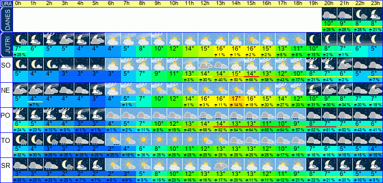 | Ura | 00h | 01h | 02h | 03h | 04h | 05h | 06h | 07h | 08h | 09h | 10h | 11h | 12h | 13h | 14h | 15h | 16h | 17h | 18h | 19h | 20h | 21h | 22h | 23h | |  |  |  |  |  |  |  |  |  |  |  |  |  |  |  |  |  |  |  |  |  |  |  |  | | Temperatura [C°] | 5°C | 4°C | 4°C | 4°C | 4°C | 3°C | 4°C | 5°C | 7°C | 10°C | 12°C | 14°C | 16°C | 16°C | 17°C | 16°C | 15°C | 14°C | 12°C | 10°C | 9°C | 8°C | 7°C | 7°C | | Občutek [C°] | 3°C | 2°C | 2°C | 2°C | 1°C | 2°C | 1°C | 3°C | 6°C | 9°C | 10°C | 12°C | 13°C | 14°C | 15°C | 14°C | 14°C | 11°C | 10°C | 9°C | 7°C | 6°C | 5°C | 5°C | | Možnost padavin | | 7 % | | | | | | 1 % | | | | 1 % | 3 % | 11 % | 14 % | 18 % | 21 % | 27 % | 33 % | 31 % | 30 % | 34 % | 20 % | 18 % | | Količina padavin [mm] | | | | | | | | | | | | | | | | | | | | | | | | | Sneg [cm] | | | | | | | | | | | | | | | | | | | | | | | | | | UV index | | | | | | | | | | | UV 1 | UV 2 | UV 2 | UV 2 | UV 1 | | | | | | | | | | | Hitrost vetra | 3 km/h | 4 km/h | 3 km/h | 4 km/h | 5 km/h | 1 km/h | 5 km/h | 3 km/h | 3 km/h | 1 km/h | 5 km/h | 5 km/h | 8 km/h | 3 km/h | 2 km/h | 4 km/h | 2 km/h | 7 km/h | 3 km/h | 1 km/h | 4 km/h | 3 km/h | 5 km/h | 4 km/h | Smer vetra | Z | Z | Z | Z | Z | Z | Z | Z | S | S | V | V | V | V | V | V | J | J | Z | Z | Z | Z | Z | Z | | Zračni tlak | 1009 | 1009 | 1009 | 1009 | 1009 | 1010 | 1010 | 1011 | 1011 | 1011 | 1012 | 1012 | 1012 | 1011 | 1011 | 1011 | 1011 | 1012 | 1013 | 1013 | 1014 | 1014 | 1015 | 1015 | | Vlaga | 99 % | 100 % | 99 % | 100 % | 100 % | 100 % | 100 % | 93 % | 79 % | 67 % | 59 % | 52 % | 47 % | 43 % | 42 % | 44 % | 48 % | 55 % | 63 % | 71 % | 77 % | 79 % | 82 % | 85 % |
