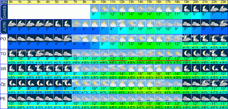 Ura | 00h | 01h | 02h | 03h | 04h | 05h | 06h | 07h | 08h | 09h | 10h | 11h | 12h | 13h | 14h | 15h | 16h | 17h | 18h | 19h | 20h | 21h | 22h | 23h | |  |  |  |  |  |  |  |  |  |  |  |  |  |  |  |  |  |  |  |  |  |  |  |  | Temperatura [C°] | 9°C | 8°C | 8°C | 8°C | 7°C | 7°C | 8°C | 8°C | 9°C | 10°C | 11°C | 13°C | 14°C | 15°C | 16°C | 16°C | 16°C | 15°C | 14°C | 13°C | 12°C | 11°C | 10°C | 10°C | Občutek [C°] | 8°C | 7°C | 7°C | 6°C | 6°C | 6°C | 6°C | 6°C | 7°C | 9°C | 10°C | 12°C | 13°C | 13°C | 14°C | 14°C | 13°C | 13°C | 12°C | 11°C | 10°C | 9°C | 9°C | 8°C | Možnost padavin | 20 % | 12 % | 10 % | 9 % | 8 % | 1 % | 1 % | 1 % | 7 % | 8 % | 8 % | 15 % | 10 % | 5 % | 6 % | 6 % | 7 % | 7 % | 7 % | 8 % | 8 % | 8 % | 20 % | 20 % | Količina padavin [mm] | | | | | | | | | | | | | | | | | | | | | | | | | Sneg [cm] | | | | | | | | | | | | | | | | | | | | | | | | | UV index | | | | | | | | | | | | UV 1 | UV 1 | UV 1 | UV 2 | UV 1 | UV 1 | | | | | | | | Hitrost vetra | 4 km/h | 4 km/h | 5 km/h | 5 km/h | 5 km/h | 5 km/h | 5 km/h | 5 km/h | 5 km/h | 5 km/h | 6 km/h | 7 km/h | 8 km/h | 10 km/h | 11 km/h | 12 km/h | 12 km/h | 11 km/h | 9 km/h | 9 km/h | 8 km/h | 8 km/h | 8 km/h | 7 km/h | Smer vetra | S | S | S | S | S | S | S | S | S | S | Z | J | J | J | J | J | J | J | J | J | Z | Z | Z | Z | Zračni tlak | 1013 | 1013 | 1013 | 1013 | 1013 | 1013 | 1013 | 1013 | 1013 | 1012 | 1012 | 1012 | 1011 | 1010 | 1010 | 1009 | 1009 | 1009 | 1009 | 1009 | 1010 | 1010 | 1011 | 1011 | Vlaga | 98 % | 99 % | 99 % | 100 % | 99 % | 98 % | 98 % | 97 % | 95 % | 92 % | 88 % | 83 % | 78 % | 73 % | 69 % | 68 % | 69 % | 72 % | 76 % | 82 % | 87 % | 90 % | 92 % | 94 % |