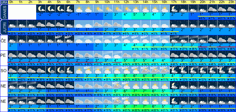 | Ura | 00h | 01h | 02h | 03h | 04h | 05h | 06h | 07h | 08h | 09h | 10h | 11h | 12h | 13h | 14h | 15h | 16h | 17h | 18h | 19h | 20h | 21h | 22h | 23h | |  |  |  |  |  |  |  |  |  |  |  |  |  |  |  |  |  |  |  |  |  |  |  |  | | Temperatura [C°] | 2°C | 2°C | 2°C | 2°C | 1°C | 1°C | 1°C | 1°C | 1°C | 2°C | 3°C | 5°C | 6°C | 7°C | 7°C | 6°C | 5°C | 3°C | 2°C | 2°C | 1°C | 1°C | 1°C | 1°C | | Občutek [C°] | -0°C | -1°C | -1°C | -1°C | -1°C | -2°C | -2°C | -2°C | -2°C | -1°C | 1°C | 2°C | 4°C | 4°C | 4°C | 3°C | 2°C | 1°C | 0°C | -1°C | -1°C | -1°C | -1°C | -2°C | | Možnost padavin | 11 % | 17 % | 11 % | 11 % | 12 % | 13 % | 14 % | 15 % | 17 % | 18 % | 19 % | 20 % | 21 % | 22 % | 22 % | 22 % | 21 % | 21 % | 21 % | 21 % | 19 % | 18 % | 16 % | 14 % | | Količina padavin [mm] | | | | | | | | | | | | | | | | | | | | | | | | | Sneg [cm] | | | | | | | | | | | | | | | | | | | | | | | | | | UV index | | | | | | | | | | | | | | | | | | | | | | | | | | Hitrost vetra | 3 km/h | 3 km/h | 3 km/h | 3 km/h | 3 km/h | 4 km/h | 4 km/h | 4 km/h | 4 km/h | 4 km/h | 3 km/h | 3 km/h | 3 km/h | 3 km/h | 3 km/h | 3 km/h | 2 km/h | 2 km/h | 2 km/h | 2 km/h | 2 km/h | 2 km/h | 2 km/h | 2 km/h | Smer vetra | S | S | S | S | S | S | S | S | S | S | S | S | S | S | S | S | S | S | S | S | S | S | S | S | | Zračni tlak | 1015 | 1015 | 1015 | 1015 | 1015 | 1016 | 1016 | 1016 | 1016 | 1016 | 1017 | 1016 | 1016 | 1016 | 1016 | 1016 | 1016 | 1017 | 1017 | 1018 | 1018 | 1018 | 1019 | 1019 | | Vlaga | 100 % | 100 % | 100 % | 100 % | 100 % | 98 % | 99 % | 98 % | 97 % | 97 % | 93 % | 84 % | 78 % | 72 % | 71 % | 77 % | 83 % | 89 % | 91 % | 93 % | 96 % | 96 % | 96 % | 97 % |