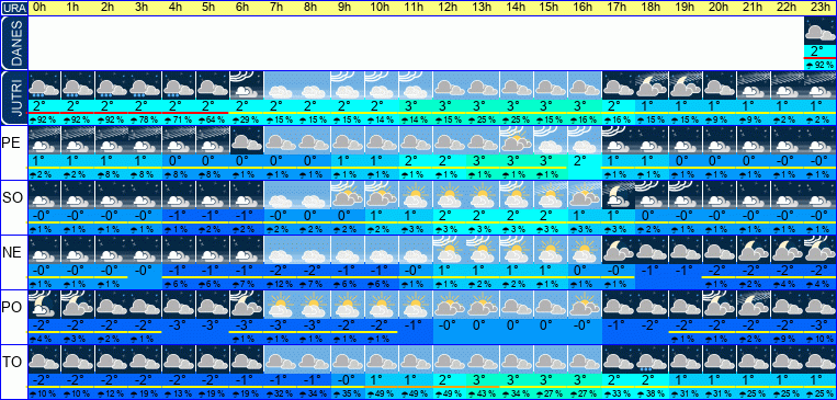 | Ura | 00h | 01h | 02h | 03h | 04h | 05h | 06h | 07h | 08h | 09h | 10h | 11h | 12h | 13h | 14h | 15h | 16h | 17h | 18h | 19h | 20h | 21h | 22h | 23h | |  |  |  |  |  |  |  |  |  |  |  |  |  |  |  |  |  |  |  |  |  |  |  |  | | Temperatura [C°] | 2°C | 2°C | 2°C | 2°C | 2°C | 2°C | 2°C | 2°C | 2°C | 2°C | 2°C | 3°C | 3°C | 3°C | 3°C | 3°C | 3°C | 2°C | 1°C | 1°C | 1°C | 1°C | 1°C | 1°C | | Občutek [C°] | -1°C | -1°C | -0°C | -0°C | -1°C | -1°C | -1°C | -0°C | -0°C | -0°C | -0°C | -0°C | 0°C | 0°C | 1°C | 1°C | -0°C | -1°C | -1°C | -2°C | -2°C | -2°C | -2°C | -2°C | | Možnost padavin | 92 % | 92 % | 92 % | 78 % | 71 % | 64 % | 29 % | 15 % | 15 % | 15 % | 14 % | 14 % | 15 % | 25 % | 25 % | 15 % | 16 % | 16 % | 15 % | 15 % | 9 % | 9 % | 2 % | 2 % | | Količina padavin [mm] | 2 mm | 1 mm | 1 mm | 1 mm | | | | | | | | | | | | | | | | | | | | | Sneg [cm] | | | | | | | | | | | | | | | | | | | | | | | | | | UV index | | | | | | | | | | | | | | | | | | | | | | | | | | Hitrost vetra | 3 km/h | 3 km/h | 3 km/h | 3 km/h | 3 km/h | 3 km/h | 3 km/h | 2 km/h | 2 km/h | 3 km/h | 3 km/h | 3 km/h | 4 km/h | 4 km/h | 4 km/h | 4 km/h | 4 km/h | 4 km/h | 3 km/h | 3 km/h | 2 km/h | 2 km/h | 2 km/h | 2 km/h | Smer vetra | S | S | S | S | S | Z | S | S | Z | S | S | S | S | S | S | Z | S | V | Z | S | J | J | J | J | | Zračni tlak | 993 | 993 | 993 | 993 | 994 | 994 | 994 | 995 | 995 | 996 | 996 | 997 | 997 | 997 | 997 | 998 | 998 | 999 | 1000 | 1000 | 1001 | 1001 | 1001 | 1002 | | Vlaga | 98 % | 97 % | 96 % | 95 % | 95 % | 95 % | 95 % | 94 % | 93 % | 92 % | 91 % | 90 % | 87 % | 85 % | 82 % | 82 % | 85 % | 90 % | 93 % | 94 % | 94 % | 95 % | 95 % | 96 % |