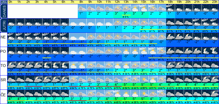 | Ura | 00h | 01h | 02h | 03h | 04h | 05h | 06h | 07h | 08h | 09h | 10h | 11h | 12h | 13h | 14h | 15h | 16h | 17h | 18h | 19h | 20h | 21h | 22h | 23h | |  |  |  |  |  |  |  |  |  |  |  |  |  |  |  |  |  |  |  |  |  |  |  |  | | Temperatura [C°] | -0°C | -0°C | -0°C | -0°C | -1°C | -1°C | -1°C | -1°C | -1°C | -0°C | 0°C | 1°C | 1°C | 1°C | 1°C | 1°C | 0°C | -0°C | -1°C | -1°C | -2°C | -2°C | -2°C | -2°C | | Občutek [C°] | -3°C | -3°C | -3°C | -3°C | -4°C | -4°C | -4°C | -4°C | -4°C | -4°C | -3°C | -3°C | -3°C | -3°C | -2°C | -3°C | -3°C | -4°C | -4°C | -5°C | -5°C | -5°C | -5°C | -5°C | | Možnost padavin | 1 % | 1 % | 1 % | 8 % | 8 % | 8 % | 8 % | 8 % | 8 % | 9 % | 9 % | 3 % | 3 % | 9 % | 2 % | 1 % | 1 % | | | | | | | | | Količina padavin [mm] | | | | | | | | | | | | | | | | | | | | | | | | | Sneg [cm] | | | | | | | | | | | | | | | | | | | | | | | | | | UV index | | | | | | | | | | | | | | | | | | | | | | | | | | Hitrost vetra | 4 km/h | 4 km/h | 4 km/h | 4 km/h | 4 km/h | 4 km/h | 3 km/h | 3 km/h | 3 km/h | 4 km/h | 4 km/h | 5 km/h | 6 km/h | 6 km/h | 5 km/h | 5 km/h | 5 km/h | 5 km/h | 4 km/h | 4 km/h | 4 km/h | 4 km/h | 4 km/h | 4 km/h | Smer vetra | Z | S | V | V | V | V | V | V | V | V | V | S | V | V | V | V | V | V | V | V | V | V | V | J | | Zračni tlak | 1011 | 1011 | 1012 | 1012 | 1012 | 1012 | 1012 | 1012 | 1013 | 1013 | 1013 | 1013 | 1013 | 1012 | 1012 | 1012 | 1012 | 1013 | 1013 | 1014 | 1014 | 1014 | 1014 | 1014 | | Vlaga | 94 % | 94 % | 93 % | 93 % | 93 % | 93 % | 93 % | 91 % | 89 % | 85 % | 82 % | 79 % | 76 % | 75 % | 74 % | 75 % | 79 % | 84 % | 88 % | 90 % | 91 % | 92 % | 93 % | 94 % |