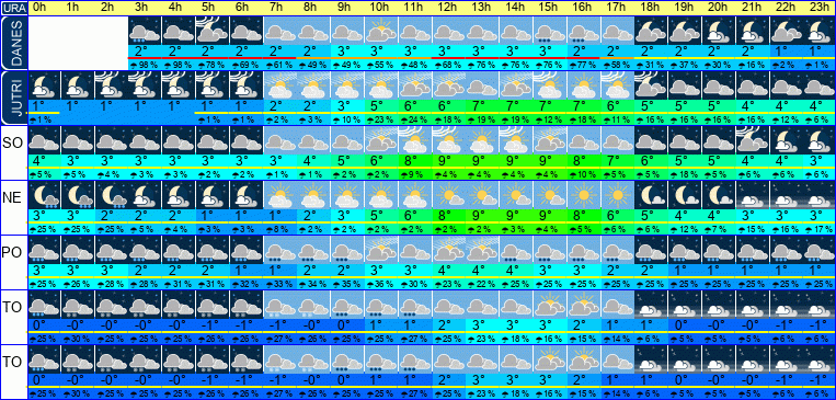 | Ura | 00h | 01h | 02h | 03h | 04h | 05h | 06h | 07h | 08h | 09h | 10h | 11h | 12h | 13h | 14h | 15h | 16h | 17h | 18h | 19h | 20h | 21h | 22h | 23h | |  |  |  |  |  |  |  |  |  |  |  |  |  |  |  |  |  |  |  |  |  |  |  |  | | Temperatura [C°] | 3°C | 3°C | 2°C | 2°C | 2°C | 1°C | 1°C | 1°C | 2°C | 3°C | 5°C | 6°C | 8°C | 9°C | 9°C | 9°C | 8°C | 6°C | 5°C | 4°C | 4°C | 3°C | 3°C | 3°C | | Občutek [C°] | 0°C | 0°C | -0°C | -1°C | -1°C | -1°C | -2°C | -1°C | -1°C | 1°C | 3°C | 4°C | 6°C | 6°C | 7°C | 6°C | 5°C | 4°C | 3°C | 2°C | 1°C | 1°C | 1°C | 1°C | | Možnost padavin | 25 % | 25 % | 25 % | 5 % | 4 % | 3 % | 3 % | 8 % | 2 % | 2 % | 2 % | 2 % | 2 % | 2 % | 3 % | 4 % | 5 % | 6 % | 6 % | 12 % | 7 % | 15 % | 16 % | 17 % | | Količina padavin [mm] | | | | | | | | | | | | | | | | | | | | | | | | | Sneg [cm] | | | | | | | | | | | | | | | | | | | | | | | | | | UV index | | | | | | | | | | | | UV 1 | UV 1 | UV 1 | UV 1 | | | | | | | | | | | Hitrost vetra | 4 km/h | 4 km/h | 5 km/h | 4 km/h | 5 km/h | 4 km/h | 4 km/h | 4 km/h | 4 km/h | 4 km/h | 3 km/h | 3 km/h | 3 km/h | 3 km/h | 2 km/h | 2 km/h | 3 km/h | 3 km/h | 3 km/h | 3 km/h | 3 km/h | 3 km/h | 3 km/h | 3 km/h | Smer vetra | Z | S | Z | S | S | S | S | S | Z | Z | Z | Z | J | J | J | J | Z | J | J | J | J | J | V | J | | Zračni tlak | 1008 | 1009 | 1009 | 1009 | 1009 | 1010 | 1010 | 1010 | 1011 | 1011 | 1011 | 1011 | 1011 | 1011 | 1011 | 1010 | 1010 | 1011 | 1011 | 1012 | 1012 | 1012 | 1013 | 1013 | | Vlaga | 93 % | 92 % | 93 % | 94 % | 95 % | 96 % | 98 % | 98 % | 94 % | 89 % | 83 % | 76 % | 71 % | 67 % | 66 % | 67 % | 71 % | 76 % | 82 % | 85 % | 87 % | 89 % | 90 % | 91 % |