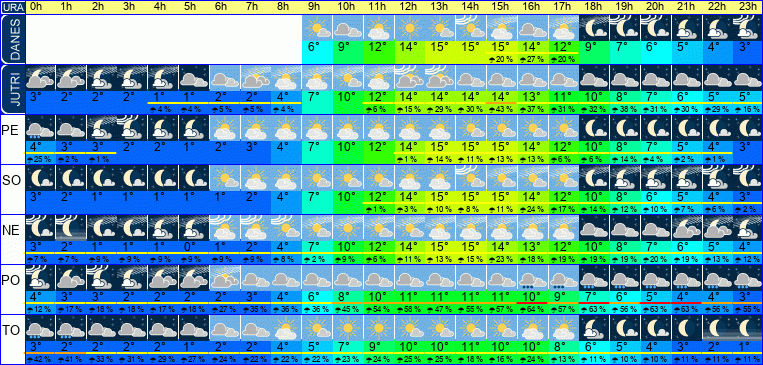 | Ura | 07h | 08h | 09h | 10h | 11h | 12h | 13h | 14h | 15h | 16h | 17h | 18h | 19h | 20h | 21h | 22h | 23h | | | | | | | | |  |  |  |  |  |  |  |  |  |  |  |  |  |  |  |  |  | | Temperatura [C°] | 0°C | 3°C | 6°C | 9°C | 12°C | 14°C | 15°C | 15°C | 15°C | 14°C | 12°C | 9°C | 7°C | 6°C | 5°C | 4°C | 3°C | | Občutek [C°] | -3°C | -0°C | 3°C | 6°C | 9°C | 10°C | 11°C | 12°C | 11°C | 10°C | 8°C | 6°C | 5°C | 3°C | 2°C | 1°C | 0°C | | Možnost padavin | | | | | | | | 13 % | 13 % | 14 % | 6 % | 6 % | | | 1 % | 1 % | | | Količina padavin [mm] | | | | | | | | | | | | | | | | | | Sneg [cm] | | | | | | | | | | | | | | | | | | | UV index | | | | UV 1 | UV 1 | UV 2 | UV 2 | UV 2 | UV 2 | UV 1 | | | | | | | | | Hitrost vetra | 5 km/h | 5 km/h | 5 km/h | 6 km/h | 7 km/h | 8 km/h | 9 km/h | 10 km/h | 11 km/h | 10 km/h | 10 km/h | 8 km/h | 7 km/h | 6 km/h | 6 km/h | 5 km/h | 5 km/h | Smer vetra | J | J | J | J | Z | Z | J | J | J | J | J | J | J | J | J | J | J | | Zračni tlak | 1023 | 1023 | 1022 | 1022 | 1021 | 1020 | 1020 | 1019 | 1019 | 1018 | 1019 | 1019 | 1020 | 1020 | 1020 | 1021 | 1021 | | Vlaga | 98 % | 90 % | 75 % | 62 % | 54 % | 49 % | 46 % | 46 % | 50 % | 50 % | 57 % | 68 % | 81 % | 89 % | 92 % | 95 % | 99 % |