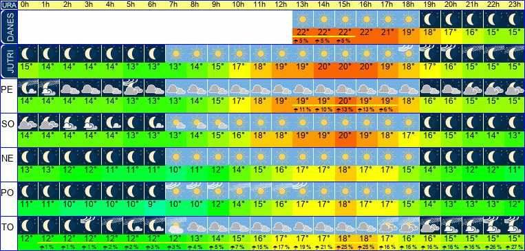 Ura | 11h | 12h | 13h | 14h | 15h | 16h | 17h | 18h | 19h | 20h | 21h | 22h | 23h | | | | | | | | | | | | |  |  |  |  |  |  |  |  |  |  |  |  |  | Temperatura [C°] | 18°C | 19°C | 19°C | 20°C | 20°C | 20°C | 19°C | 18°C | 17°C | 16°C | 15°C | 15°C | 15°C | Občutek [C°] | 16°C | 17°C | 18°C | 18°C | 17°C | 17°C | 17°C | 17°C | 15°C | 12°C | 12°C | 12°C | 12°C | Možnost padavin | | 5 % | 5 % | 5 % | 5 % | | | | | | | | | Količina padavin [mm] | | | | | | | | | | | | | | Sneg [cm] | | | | | | | | | | | | | | UV index | UV 2 | UV 2 | UV 3 | UV 3 | UV 3 | UV 2 | UV 1 | | | | | | | Hitrost vetra | 4 km/h | 5 km/h | 5 km/h | 7 km/h | 9 km/h | 9 km/h | 7 km/h | 4 km/h | 8 km/h | 17 km/h | 16 km/h | 14 km/h | 12 km/h | Smer vetra | Z | Z | Z | Z | S | S | S | V | V | V | V | V | V | Zračni tlak | 1022 | 1022 | 1021 | 1021 | 1021 | 1021 | 1021 | 1021 | 1022 | 1022 | 1022 | 1022 | 1022 | Vlaga | 46 % | 46 % | 44 % | 39 % | 38 % | 39 % | 43 % | 52 % | 52 % | 54 % | 56 % | 57 % | 59 % |