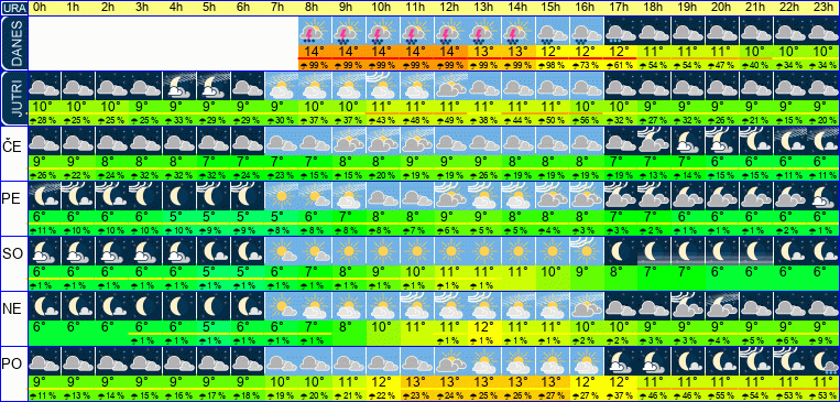 | Ura | 06h | 07h | 08h | 09h | 10h | 11h | 12h | 13h | 14h | 15h | 16h | 17h | 18h | 19h | 20h | 21h | 22h | 23h | | | | | | | |  |  |  |  |  |  |  |  |  |  |  |  |  |  |  |  |  |  | | Temperatura [C°] | 14°C | 14°C | 14°C | 14°C | 14°C | 14°C | 14°C | 13°C | 13°C | 12°C | 12°C | 12°C | 11°C | 11°C | 11°C | 10°C | 10°C | 10°C | | Občutek [C°] | 9°C | 10°C | 10°C | 12°C | 12°C | 14°C | 14°C | 13°C | 8°C | 9°C | 8°C | 9°C | 9°C | 9°C | 8°C | 9°C | 9°C | 9°C | | Možnost padavin | 79 % | 93 % | 99 % | 99 % | 99 % | 99 % | 99 % | 99 % | 99 % | 98 % | 74 % | 61 % | 55 % | 55 % | 48 % | 40 % | 34 % | 34 % | | Količina padavin [mm] | | | | 1 mm | 3 mm | 4 mm | 3 mm | 2 mm | 1 mm | 1 mm | | | | | | | | | Sneg [cm] | | | | | | | | | | | | | | | | | | | | UV index | | | | | | | | | | | | | | | | | | | | Hitrost vetra | 28 km/h | 26 km/h | 24 km/h | 19 km/h | 14 km/h | 4 km/h | 4 km/h | 6 km/h | 23 km/h | 17 km/h | 18 km/h | 9 km/h | 9 km/h | 9 km/h | 9 km/h | 4 km/h | 6 km/h | 5 km/h | Smer vetra | J | J | J | J | J | S | S | J | S | S | S | S | S | Z | Z | S | Z | Z | | Zračni tlak | 1000 | 1000 | 1000 | 1000 | 1000 | 999 | 999 | 998 | 998 | 999 | 999 | 999 | 999 | 999 | 1000 | 1000 | 1001 | 1001 | | Vlaga | 91 % | 90 % | 91 % | 91 % | 83 % | 86 % | 86 % | 91 % | 85 % | 81 % | 71 % | 70 % | 69 % | 81 % | 81 % | 84 % | 88 % | 90 % |