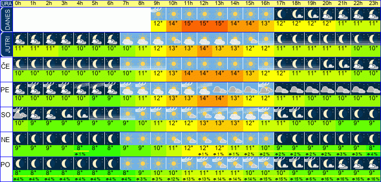 | Ura | 07h | 08h | 09h | 10h | 11h | 12h | 13h | 14h | 15h | 16h | 17h | 18h | 19h | 20h | 21h | 22h | 23h | | | | | | | | |  |  |  |  |  |  |  |  |  |  |  |  |  |  |  |  |  | | Temperatura [C°] | 11°C | 11°C | 12°C | 13°C | 14°C | 14°C | 14°C | 13°C | 13°C | 12°C | 11°C | 11°C | 10°C | 10°C | 10°C | 10°C | 10°C | | Občutek [C°] | 9°C | 10°C | 11°C | 12°C | 13°C | 12°C | 13°C | 12°C | 11°C | 11°C | 10°C | 9°C | 9°C | 8°C | 8°C | 8°C | 8°C | | Možnost padavin | | | | | | | | | | | | | | | | | | | Količina padavin [mm] | | | | | | | | | | | | | | | | | | Sneg [cm] | | | | | | | | | | | | | | | | | | | UV index | | | | | UV 1 | UV 1 | UV 1 | UV 1 | UV 1 | | | | | | | | | | Hitrost vetra | 1 km/h | 2 km/h | 3 km/h | 1 km/h | 1 km/h | 4 km/h | 4 km/h | 3 km/h | 3 km/h | 2 km/h | 3 km/h | 3 km/h | 4 km/h | 6 km/h | 6 km/h | 5 km/h | 4 km/h | Smer vetra | V | V | V | V | S | Z | S | Z | Z | S | V | J | J | J | J | V | V | | Zračni tlak | 1013 | 1013 | 1013 | 1014 | 1013 | 1013 | 1012 | 1012 | 1013 | 1013 | 1013 | 1013 | 1013 | 1013 | 1014 | 1014 | 1014 | | Vlaga | 65 % | 65 % | 65 % | 66 % | 63 % | 64 % | 67 % | 67 % | 69 % | 81 % | 80 % | 82 % | 78 % | 77 % | 75 % | 77 % | 80 % |
