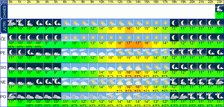 | Ura | 00h | 01h | 02h | 03h | 04h | 05h | 06h | 07h | 08h | 09h | 10h | 11h | 12h | 13h | 14h | 15h | 16h | 17h | 18h | 19h | 20h | 21h | 22h | 23h | |  |  |  |  |  |  |  |  |  |  |  |  |  |  |  |  |  |  |  |  |  |  |  |  | | Temperatura [C°] | 11°C | 10°C | 10°C | 10°C | 10°C | 10°C | 10°C | 11°C | 12°C | 13°C | 14°C | 15°C | 15°C | 16°C | 16°C | 15°C | 14°C | 13°C | 12°C | 11°C | 11°C | 11°C | 11°C | 11°C | | Občutek [C°] | 10°C | 10°C | 9°C | 9°C | 9°C | 9°C | 9°C | 10°C | 10°C | 12°C | 13°C | 14°C | 14°C | 14°C | 13°C | 13°C | 12°C | 12°C | 11°C | 10°C | 10°C | 9°C | 9°C | 9°C | | Možnost padavin | | | | | | | | | | | | | 1 % | 1 % | 2 % | 2 % | 3 % | 2 % | 1 % | | | | | | | Količina padavin [mm] | | | | | | | | | | | | | | | | | | | | | | | | | Sneg [cm] | | | | | | | | | | | | | | | | | | | | | | | | | | UV index | | | | | | | | | | | UV 1 | UV 2 | UV 2 | UV 3 | UV 2 | UV 2 | UV 1 | | | | | | | | | Hitrost vetra | 1 km/h | 2 km/h | 2 km/h | 2 km/h | 1 km/h | 2 km/h | 2 km/h | 2 km/h | 5 km/h | 3 km/h | 3 km/h | 5 km/h | 5 km/h | 5 km/h | 6 km/h | 4 km/h | 4 km/h | 3 km/h | 1 km/h | 3 km/h | 1 km/h | 2 km/h | 1 km/h | 2 km/h | Smer vetra | S | S | J | J | Z | S | S | V | V | J | Z | J | Z | Z | Z | Z | Z | Z | J | V | S | Z | Z | J | | Zračni tlak | 1026 | 1026 | 1026 | 1026 | 1026 | 1026 | 1026 | 1026 | 1026 | 1026 | 1026 | 1026 | 1026 | 1026 | 1026 | 1026 | 1025 | 1026 | 1026 | 1026 | 1027 | 1027 | 1027 | 1027 | | Vlaga | 86 % | 88 % | 88 % | 87 % | 86 % | 85 % | 83 % | 81 % | 78 % | 74 % | 70 % | 67 % | 66 % | 66 % | 54 % | 55 % | 59 % | 63 % | 68 % | 70 % | 69 % | 66 % | 65 % | 65 % |