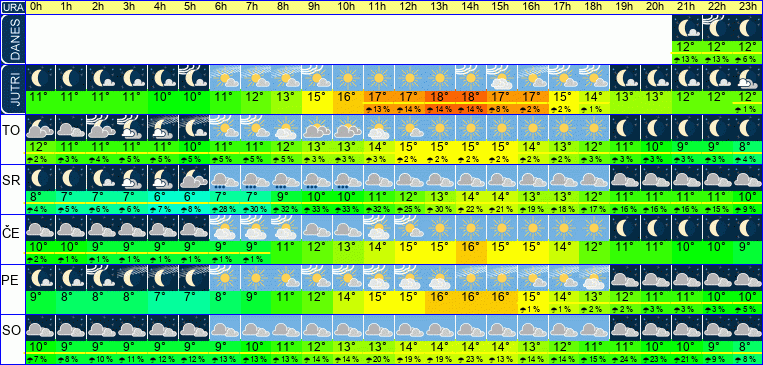 | Ura | 20h | 21h | 22h | 23h | | | | | | | | | | | | | | | | | | | | | |  |  |  |  | | Temperatura [C°] | 13°C | 12°C | 12°C | 12°C | | Občutek [C°] | 11°C | 11°C | 11°C | 11°C | | Možnost padavin | 25 % | 13 % | 13 % | 6 % | | Količina padavin [mm] | | | | | Sneg [cm] | | | | | | UV index | | | | | | Hitrost vetra | 5 km/h | 5 km/h | 5 km/h | 2 km/h | Smer vetra | S | S | Z | S | | Zračni tlak | 1011 | 1012 | 1012 | 1012 | | Vlaga | 74 % | 73 % | 74 % | 74 % |