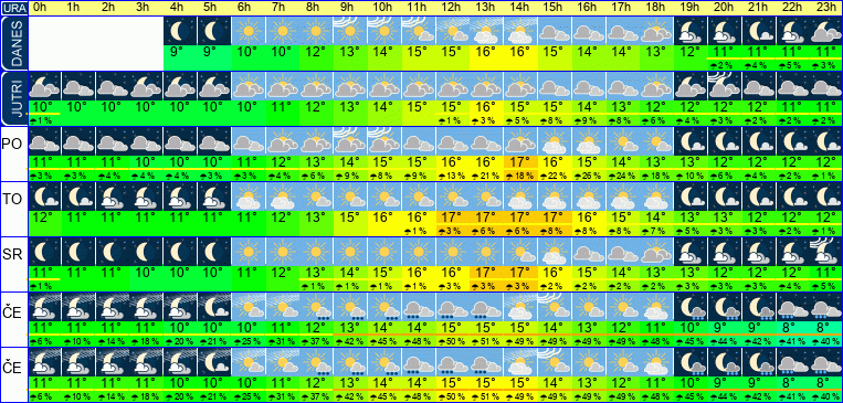 | Ura | 00h | 01h | 02h | 03h | 04h | 05h | 06h | 07h | 08h | 09h | 10h | 11h | 12h | 13h | 14h | 15h | 16h | 17h | 18h | 19h | 20h | 21h | 22h | 23h | |  |  |  |  |  |  |  |  |  |  |  |  |  |  |  |  |  |  |  |  |  |  |  |  | | Temperatura [C°] | 11°C | 11°C | 11°C | 10°C | 10°C | 10°C | 11°C | 12°C | 13°C | 14°C | 15°C | 15°C | 16°C | 16°C | 17°C | 16°C | 15°C | 14°C | 13°C | 13°C | 12°C | 12°C | 12°C | 12°C | | Občutek [C°] | 8°C | 8°C | 8°C | 8°C | 8°C | 7°C | 8°C | 9°C | 10°C | 11°C | 12°C | 13°C | 14°C | 14°C | 14°C | 13°C | 12°C | 11°C | 10°C | 10°C | 9°C | 8°C | 8°C | 8°C | | Možnost padavin | 3 % | 3 % | 4 % | 4 % | 4 % | 3 % | 3 % | 4 % | 6 % | 9 % | 8 % | 9 % | 13 % | 21 % | 18 % | 22 % | 26 % | 24 % | 18 % | 10 % | 6 % | 4 % | 2 % | 1 % | | Količina padavin [mm] | | | | | | | | | | | | | | | | | | | | | | | | | Sneg [cm] | | | | | | | | | | | | | | | | | | | | | | | | | | UV index | | | | | | | | | | UV 1 | UV 1 | UV 2 | UV 3 | UV 3 | UV 3 | UV 2 | UV 1 | UV 1 | | | | | | | | Hitrost vetra | 6 km/h | 6 km/h | 6 km/h | 6 km/h | 6 km/h | 7 km/h | 7 km/h | 7 km/h | 6 km/h | 5 km/h | 4 km/h | 1 km/h | 2 km/h | 3 km/h | 5 km/h | 7 km/h | 8 km/h | 11 km/h | 9 km/h | 9 km/h | 9 km/h | 11 km/h | 11 km/h | 14 km/h | Smer vetra | V | V | V | S | S | V | V | V | V | V | V | S | S | Z | S | S | S | S | V | V | V | V | V | V | | Zračni tlak | 1014 | 1014 | 1014 | 1014 | 1014 | 1014 | 1014 | 1014 | 1015 | 1015 | 1015 | 1015 | 1015 | 1015 | 1015 | 1015 | 1015 | 1015 | 1016 | 1017 | 1017 | 1018 | 1018 | 1018 | | Vlaga | 56 % | 57 % | 58 % | 60 % | 62 % | 62 % | 61 % | 59 % | 53 % | 47 % | 43 % | 41 % | 40 % | 39 % | 39 % | 41 % | 43 % | 45 % | 48 % | 50 % | 51 % | 53 % | 55 % | 57 % |