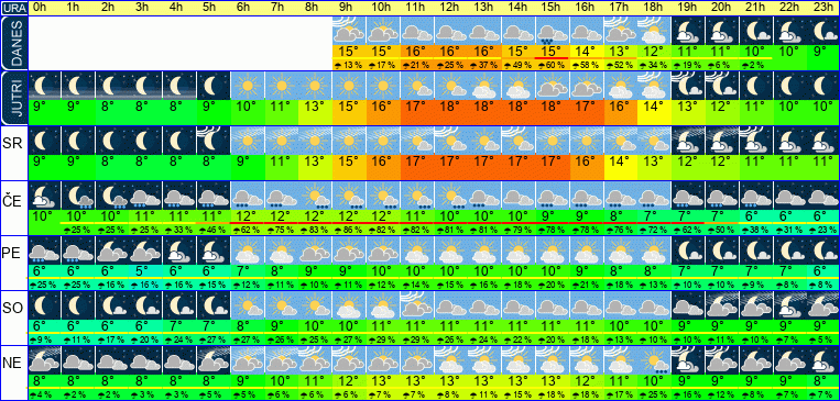 | Ura | 07h | 08h | 09h | 10h | 11h | 12h | 13h | 14h | 15h | 16h | 17h | 18h | 19h | 20h | 21h | 22h | 23h | | | | | | | | |  |  |  |  |  |  |  |  |  |  |  |  |  |  |  |  |  | | Temperatura [C°] | 12°C | 14°C | 15°C | 15°C | 16°C | 16°C | 16°C | 15°C | 15°C | 14°C | 13°C | 12°C | 11°C | 11°C | 10°C | 10°C | 9°C | | Občutek [C°] | 9°C | 10°C | 12°C | 12°C | 13°C | 13°C | 12°C | 12°C | 11°C | 10°C | 10°C | 9°C | 9°C | 8°C | 7°C | 6°C | 6°C | | Možnost padavin | 5 % | 4 % | 5 % | 9 % | 17 % | 25 % | 39 % | 54 % | 69 % | 68 % | 59 % | 42 % | 27 % | 15 % | 8 % | | | | Količina padavin [mm] | | | | | | | | 1 mm | | | 1 mm | 1 mm | | | | | | Sneg [cm] | | | | | | | | | | | | | | | | | | | UV index | | | UV 1 | UV 1 | UV 2 | UV 2 | UV 2 | UV 1 | | UV 1 | | | | | | | | | Hitrost vetra | 9 km/h | 8 km/h | 7 km/h | 7 km/h | 7 km/h | 8 km/h | 9 km/h | 10 km/h | 10 km/h | 10 km/h | 10 km/h | 9 km/h | 9 km/h | 10 km/h | 11 km/h | 12 km/h | 13 km/h | Smer vetra | V | J | J | Z | Z | Z | Z | Z | V | Z | Z | S | V | Z | J | Z | V | | Zračni tlak | 1014 | 1014 | 1014 | 1015 | 1015 | 1015 | 1015 | 1014 | 1014 | 1014 | 1015 | 1015 | 1016 | 1016 | 1016 | 1017 | 1017 | | Vlaga | 51 % | 46 % | 43 % | 40 % | 46 % | 43 % | 43 % | 48 % | 52 % | 50 % | 65 % | 70 % | 71 % | 76 % | 76 % | 77 % | 83 % |