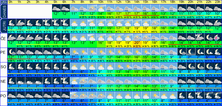 Ura | 02h | 03h | 04h | 05h | 06h | 07h | 08h | 09h | 10h | 11h | 12h | 13h | 14h | 15h | 16h | 17h | 18h | 19h | 20h | 21h | 22h | 23h | | | |  |  |  |  |  |  |  |  |  |  |  |  |  |  |  |  |  |  |  |  |  |  | Temperatura [C°] | 12°C | 12°C | 12°C | 12°C | 11°C | 11°C | 11°C | 12°C | 13°C | 15°C | 16°C | 16°C | 16°C | 16°C | 14°C | 13°C | 11°C | 11°C | 10°C | 10°C | 10°C | 10°C | Občutek [C°] | 12°C | 12°C | 12°C | 11°C | 11°C | 11°C | 11°C | 12°C | 13°C | 15°C | 16°C | 16°C | 16°C | 15°C | 14°C | 13°C | 11°C | 10°C | 10°C | 10°C | 10°C | 10°C | Možnost padavin | 6 % | | | | | | | 7 % | 25 % | 29 % | 49 % | 57 % | 83 % | 84 % | 71 % | 57 % | 50 % | 36 % | 35 % | 46 % | 27 % | 26 % | Količina padavin [mm] | | | | | | | | | | 1 mm | | | | | 1 mm | | 1 mm | | | 1 mm | | | Sneg [cm] | | | | | | | | | | | | | | | | | | | | | | | UV index | | | | | | | | | | | | | | | | | | | | | | | Hitrost vetra | 3 km/h | 3 km/h | 3 km/h | 3 km/h | 3 km/h | 3 km/h | 3 km/h | 3 km/h | 3 km/h | 3 km/h | 3 km/h | 4 km/h | 3 km/h | 3 km/h | 3 km/h | 3 km/h | 3 km/h | 3 km/h | 2 km/h | 2 km/h | 2 km/h | 2 km/h | Smer vetra | Z | Z | Z | Z | J | Z | Z | Z | J | Z | Z | Z | Z | J | J | J | J | J | J | Z | J | Z | Zračni tlak | 1009 | 1009 | 1009 | 1008 | 1008 | 1008 | 1008 | 1008 | 1008 | 1008 | 1008 | 1008 | 1008 | 1008 | 1008 | 1008 | 1008 | 1008 | 1008 | 1008 | 1008 | 1008 | Vlaga | 91 % | 91 % | 92 % | 94 % | 95 % | 95 % | 96 % | 93 % | 86 % | 80 % | 71 % | 70 % | 71 % | 75 % | 83 % | 100 % | 100 % | 100 % | 100 % | 100 % | 100 % | 100 % |