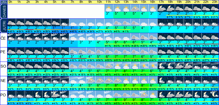 | Ura | 11h | 12h | 13h | 14h | 15h | 16h | 17h | 18h | 19h | 20h | 21h | 22h | 23h | | | | | | | | | | | | |  |  |  |  |  |  |  |  |  |  |  |  |  | | Temperatura [C°] | 5°C | 7°C | 7°C | 7°C | 5°C | 4°C | 3°C | 3°C | 3°C | 3°C | 3°C | 3°C | 2°C | | Občutek [C°] | 3°C | 4°C | 5°C | 5°C | 3°C | 2°C | 1°C | 1°C | 1°C | 1°C | 1°C | 1°C | 0°C | | Možnost padavin | 1 % | 1 % | 1 % | | 1 % | 1 % | 2 % | 8 % | 12 % | 14 % | 20 % | 25 % | 20 % | | Količina padavin [mm] | | | | | | | | | | | | | | Sneg [cm] | | | | | | | | | | | | | | | UV index | | UV 1 | UV 1 | UV 1 | | | | | | | | | | | Hitrost vetra | 1 km/h | 2 km/h | 2 km/h | 2 km/h | 2 km/h | 2 km/h | 2 km/h | 2 km/h | 2 km/h | 1 km/h | 1 km/h | 1 km/h | 1 km/h | Smer vetra | J | J | J | V | J | V | V | V | V | S | S | S | S | | Zračni tlak | 1019 | 1019 | 1018 | 1018 | 1018 | 1018 | 1018 | 1018 | 1019 | 1019 | 1019 | 1019 | 1018 | | Vlaga | 72 % | 69 % | 68 % | 73 % | 81 % | 89 % | 93 % | 95 % | 97 % | 97 % | 98 % | 98 % | 99 % |