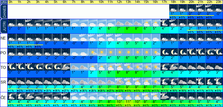 | Temperatura: | 0°C / 1°C / 4°C (+-0°C) | Možnost padavin: | 5 % | Hitrost vetra: | 1 / 1 / 2 km/h (+-2) | Skupna oblačnost: | 3 / 35 / 85 % (+-42) |