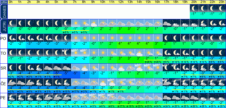 | Temperatura: | -4°C / -1°C / 3°C (+-1°C) | Možnost padavin: | 10 % | Hitrost vetra: | 2 / 2 / 3 km/h (+-5) | Skupna oblačnost: | 0 / 17 / 72 % (+-40) |