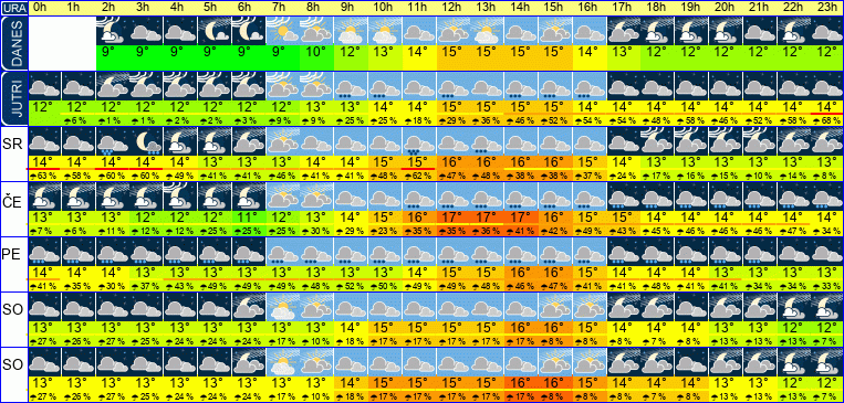 | Temperatura: | 12°C / 13°C / 15°C (+-1°C) | Možnost padavin: | 71 % | Hitrost vetra: | 7 / 10 / 11 km/h (+-5) | Skupna oblačnost: | 75 / 92 / 100 % (+-15) |