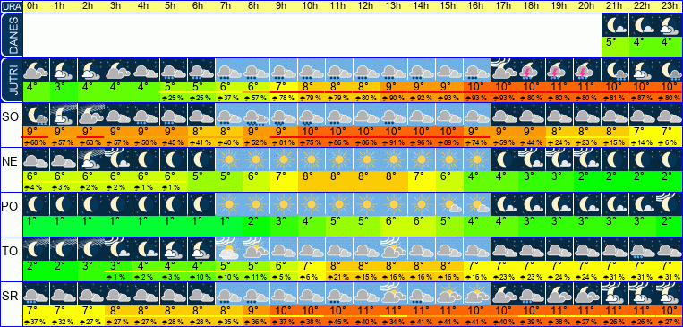 | Ura | 00h | 01h | 02h | 03h | 04h | 05h | 06h | 07h | 08h | 09h | 10h | 11h | 12h | 13h | 14h | 15h | 16h | 17h | 18h | 19h | 20h | 21h | 22h | 23h | |  |  |  |  |  |  |  |  |  |  |  |  |  |  |  |  |  |  |  |  |  |  |  |  | | Temperatura [C°] | 3°C | 3°C | 3°C | 3°C | 4°C | 4°C | 5°C | 5°C | 6°C | 7°C | 8°C | 8°C | 9°C | 9°C | 10°C | 10°C | 10°C | 10°C | 11°C | 12°C | 12°C | 11°C | 11°C | 10°C | | Občutek [C°] | -1°C | -1°C | -1°C | -0°C | 0°C | 0°C | 1°C | 1°C | 1°C | 2°C | 3°C | 3°C | 4°C | 4°C | 5°C | 5°C | 5°C | 6°C | 7°C | 8°C | 9°C | 9°C | 9°C | 8°C | | Možnost padavin | | | | | | | 22 % | 28 % | 65 % | 79 % | 87 % | 89 % | 85 % | 86 % | 97 % | 98 % | 98 % | 92 % | 92 % | 92 % | 86 % | 86 % | 78 % | 85 % | | Količina padavin [mm] | | | | | | | | 1 mm | 1 mm | 1 mm | 1 mm | 1 mm | | 1 mm | | | 1 mm | | 1 mm | 2 mm | 2 mm | | | | Sneg [cm] | | | | | | | | | | | | | | | | | | | | | | | | | | UV index | | | | | | | | | | | | | | | | | | | | | | | | | | Hitrost vetra | 5 km/h | 5 km/h | 6 km/h | 7 km/h | 7 km/h | 8 km/h | 10 km/h | 12 km/h | 14 km/h | 16 km/h | 17 km/h | 18 km/h | 19 km/h | 20 km/h | 21 km/h | 21 km/h | 20 km/h | 18 km/h | 16 km/h | 13 km/h | 11 km/h | 10 km/h | 9 km/h | 7 km/h | Smer vetra | S | S | V | V | V | V | V | V | V | V | V | V | V | V | V | V | V | V | V | V | V | S | S | S | | Zračni tlak | 1016 | 1016 | 1015 | 1015 | 1015 | 1015 | 1014 | 1014 | 1014 | 1013 | 1013 | 1012 | 1011 | 1010 | 1008 | 1007 | 1006 | 1005 | 1004 | 1003 | 1003 | 1003 | 1003 | 1002 | | Vlaga | 55 % | 55 % | 59 % | 64 % | 66 % | 65 % | 67 % | 67 % | 68 % | 69 % | 69 % | 71 % | 72 % | 72 % | 73 % | 73 % | 75 % | 74 % | 72 % | 72 % | 74 % | 80 % | 85 % | 86 % |