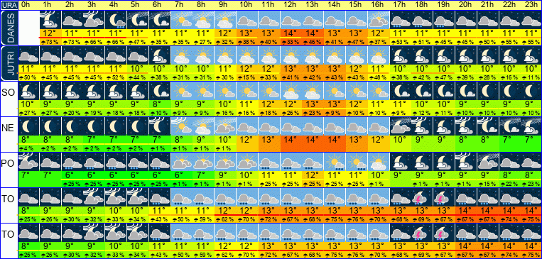 | Ura | 00h | 01h | 02h | 03h | 04h | 05h | 06h | 07h | 08h | 09h | 10h | 11h | 12h | 13h | 14h | 15h | 16h | 17h | 18h | 19h | 20h | 21h | 22h | 23h | |  |  |  |  |  |  |  |  |  |  |  |  |  |  |  |  |  |  |  |  |  |  |  |  | | Temperatura [C°] | 12°C | 12°C | 11°C | 11°C | 11°C | 11°C | 11°C | 11°C | 11°C | 12°C | 13°C | 13°C | 14°C | 14°C | 13°C | 13°C | 12°C | 11°C | 11°C | 11°C | 11°C | 11°C | 11°C | 11°C | | Občutek [C°] | 10°C | 10°C | 9°C | 9°C | 9°C | 9°C | 8°C | 9°C | 9°C | 10°C | 11°C | 12°C | 12°C | 12°C | 12°C | 11°C | 11°C | 10°C | 10°C | 10°C | 10°C | 10°C | 10°C | 10°C | | Možnost padavin | 73 % | 73 % | 73 % | 66 % | 66 % | 47 % | 35 % | 35 % | 27 % | 32 % | 38 % | 40 % | 33 % | 46 % | 41 % | 47 % | 37 % | 53 % | 51 % | 45 % | 45 % | 50 % | 55 % | 55 % | | Količina padavin [mm] | | | | | | | | | | | | | | | | | | | | | | | | | Sneg [cm] | | | | | | | | | | | | | | | | | | | | | | | | | | UV index | | | | | | | | | | | | UV 1 | UV 1 | UV 1 | UV 1 | | | | | | | | | | | Hitrost vetra | 7 km/h | 6 km/h | 7 km/h | 9 km/h | 10 km/h | 9 km/h | 9 km/h | 9 km/h | 9 km/h | 9 km/h | 9 km/h | 8 km/h | 7 km/h | 6 km/h | 5 km/h | 5 km/h | 4 km/h | 4 km/h | 5 km/h | 5 km/h | 5 km/h | 5 km/h | 6 km/h | 6 km/h | Smer vetra | V | V | V | V | V | V | V | V | V | V | V | V | V | V | V | Z | Z | S | S | Z | Z | S | S | S | | Zračni tlak | 995 | 996 | 996 | 996 | 996 | 995 | 995 | 995 | 995 | 995 | 995 | 995 | 994 | 994 | 994 | 994 | 994 | 995 | 995 | 995 | 996 | 996 | 997 | 997 | | Vlaga | 86 % | 85 % | 86 % | 86 % | 87 % | 87 % | 88 % | 89 % | 86 % | 82 % | 79 % | 76 % | 74 % | 73 % | 75 % | 78 % | 81 % | 83 % | 83 % | 82 % | 82 % | 82 % | 81 % | 80 % |