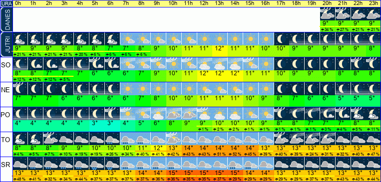 | Ura | 00h | 01h | 02h | 03h | 04h | 05h | 06h | 07h | 08h | 09h | 10h | 11h | 12h | 13h | 14h | 15h | 16h | 17h | 18h | 19h | 20h | 21h | 22h | 23h | |  |  |  |  |  |  |  |  |  |  |  |  |  |  |  |  |  |  |  |  |  |  |  |  | | Temperatura [C°] | 9°C | 9°C | 9°C | 9°C | 8°C | 8°C | 7°C | 7°C | 8°C | 9°C | 10°C | 11°C | 11°C | 12°C | 11°C | 11°C | 10°C | 10°C | 9°C | 9°C | 9°C | 9°C | 9°C | 8°C | | Občutek [C°] | 7°C | 7°C | 7°C | 7°C | 6°C | 6°C | 5°C | 5°C | 6°C | 8°C | 9°C | 9°C | 9°C | 9°C | 9°C | 9°C | 8°C | 7°C | 7°C | 7°C | 7°C | 7°C | 7°C | 7°C | | Možnost padavin | 21 % | 21 % | 21 % | 21 % | 20 % | 6 % | 6 % | 6 % | 6 % | | | | | | | | | | | | | | | | | Količina padavin [mm] | | | | | | | | | | | | | | | | | | | | | | | | | Sneg [cm] | | | | | | | | | | | | | | | | | | | | | | | | | | UV index | | | | | | | | | | | | UV 1 | UV 1 | UV 1 | UV 1 | UV 1 | | | | | | | | | | Hitrost vetra | 7 km/h | 6 km/h | 6 km/h | 7 km/h | 7 km/h | 6 km/h | 6 km/h | 6 km/h | 6 km/h | 5 km/h | 4 km/h | 3 km/h | 4 km/h | 5 km/h | 6 km/h | 7 km/h | 7 km/h | 6 km/h | 5 km/h | 5 km/h | 4 km/h | 4 km/h | 4 km/h | 4 km/h | Smer vetra | S | V | V | V | V | V | V | V | V | V | V | S | S | S | Z | Z | S | S | S | S | S | S | S | S | | Zračni tlak | 999 | 999 | 999 | 1000 | 1000 | 1000 | 1000 | 1000 | 1000 | 1001 | 1001 | 1001 | 1001 | 1000 | 1000 | 1000 | 1000 | 1001 | 1001 | 1001 | 1002 | 1002 | 1002 | 1002 | | Vlaga | 89 % | 92 % | 93 % | 91 % | 89 % | 92 % | 93 % | 91 % | 85 % | 82 % | 74 % | 68 % | 62 % | 60 % | 63 % | 71 % | 74 % | 77 % | 82 % | 82 % | 84 % | 84 % | 86 % | 88 % |