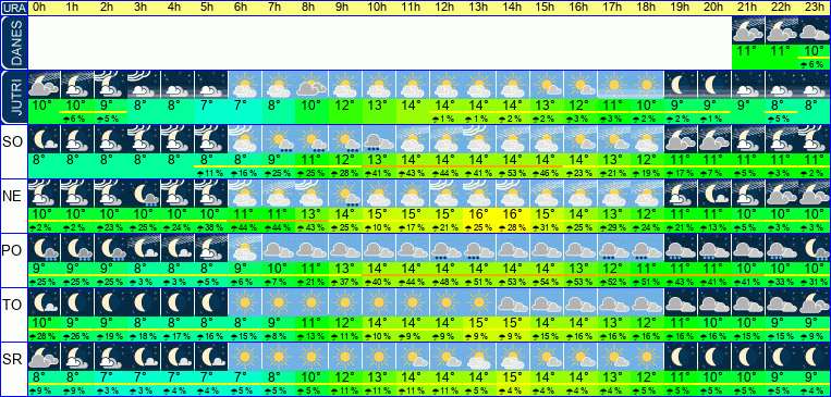 | Ura | 00h | 01h | 02h | 03h | 04h | 05h | 06h | 07h | 08h | 09h | 10h | 11h | 12h | 13h | 14h | 15h | 16h | 17h | 18h | 19h | 20h | 21h | 22h | 23h | |  |  |  |  |  |  |  |  |  |  |  |  |  |  |  |  |  |  |  |  |  |  |  |  | | Temperatura [C°] | 8°C | 8°C | 7°C | 7°C | 7°C | 7°C | 7°C | 8°C | 9°C | 10°C | 12°C | 13°C | 14°C | 14°C | 14°C | 13°C | 12°C | 11°C | 10°C | 9°C | 8°C | 8°C | 8°C | 7°C | | Občutek [C°] | 5°C | 5°C | 5°C | 5°C | 5°C | 4°C | 4°C | 5°C | 6°C | 8°C | 10°C | 11°C | 12°C | 12°C | 12°C | 11°C | 10°C | 9°C | 8°C | 8°C | 7°C | 6°C | 5°C | 4°C | | Možnost padavin | | | | | | | | | | | | | | | | | | | | | | | | | | Količina padavin [mm] | | | | | | | | | | | | | | | | | | | | | | | | | Sneg [cm] | | | | | | | | | | | | | | | | | | | | | | | | | | UV index | | | | | | | | | | | | UV 1 | UV 1 | UV 1 | UV 1 | | | | | | | | | | | Hitrost vetra | 7 km/h | 7 km/h | 7 km/h | 7 km/h | 7 km/h | 7 km/h | 7 km/h | 7 km/h | 6 km/h | 5 km/h | 4 km/h | 5 km/h | 6 km/h | 7 km/h | 7 km/h | 6 km/h | 5 km/h | 4 km/h | 4 km/h | 5 km/h | 6 km/h | 7 km/h | 8 km/h | 8 km/h | Smer vetra | V | V | V | V | V | V | V | V | V | V | V | J | Z | Z | Z | Z | Z | S | V | V | V | V | V | V | | Zračni tlak | 1024 | 1024 | 1024 | 1024 | 1024 | 1024 | 1024 | 1024 | 1024 | 1024 | 1025 | 1024 | 1024 | 1024 | 1023 | 1023 | 1023 | 1023 | 1023 | 1024 | 1024 | 1023 | 1023 | 1023 | | Vlaga | 81 % | 82 % | 82 % | 81 % | 80 % | 78 % | 77 % | 73 % | 69 % | 66 % | 66 % | 65 % | 65 % | 65 % | 68 % | 73 % | 79 % | 84 % | 85 % | 86 % | 88 % | 87 % | 85 % | 85 % |