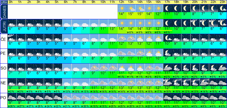 | Ura | 06h | 07h | 08h | 09h | 10h | 11h | 12h | 13h | 14h | 15h | 16h | 17h | 18h | 19h | 20h | 21h | 22h | 23h |             |             |             |             |             |             |   |   |   |   |   |   |   |   |   |   |   |   |   |   |   |   |   |   |   |  | Temperatura [C°] | 6°C | 7°C | 8°C | 10°C | 12°C | 13°C | 14°C | 14°C | 14°C | 14°C | 12°C | 11°C | 10°C | 9°C | 8°C | 8°C | 7°C | 7°C |  | Občutek [C°] | 4°C | 4°C | 6°C | 8°C | 10°C | 11°C | 12°C | 12°C | 12°C | 12°C | 11°C | 9°C | 8°C | 7°C | 6°C | 5°C | 5°C | 5°C |  | Možnost padavin |  |  |  |  |  |  |  |  |  |  |  |  |  |  |  |  |  |  |  | Količina padavin [mm]  |  |  |  |  |  |  |  |  |  |  |  |  |  |  |  |  |  |  |  Sneg [cm]  |  |  |  |  |  |  |  |  |  |  |  |  |  |  |  |  |  |  | | UV index |  |  |  |  | UV 1 | UV 2 | UV 2 | UV 2 | UV 2 | UV 1 |  |  |  |  |  |  |  |  |  | Hitrost vetra | 4 km/h | 5 km/h | 4 km/h | 4 km/h | 4 km/h | 5 km/h | 6 km/h | 7 km/h | 6 km/h | 6 km/h | 5 km/h | 5 km/h | 6 km/h | 6 km/h | 6 km/h | 6 km/h | 6 km/h | 5 km/h |  Smer vetra | Z | Z | Z | Z | Z | V | V | J | J | J | J | J | J | J | J | J | J | J | | Zračni tlak | 1028 | 1029 | 1029 | 1029 | 1029 | 1028 | 1028 | 1027 | 1027 | 1027 | 1026 | 1027 | 1027 | 1027 | 1027 | 1027 | 1028 | 1028 |  | Vlaga | 77 % | 77 % | 78 % | 73 % | 70 % | 65 % | 60 % | 60 % | 59 % | 62 % | 68 % | 71 % | 74 % | 77 % | 80 % | 80 % | 81 % | 82 % |