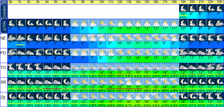 Občutek temperature: | 7°C / 9°C / 11°C | Padavine: | 10 mm (+-15 mm) | Sunki vetra: | 7 / 9 / 10 km/h (+-0) | Visoka oblačnost: | 0 / 55 / 100 % |