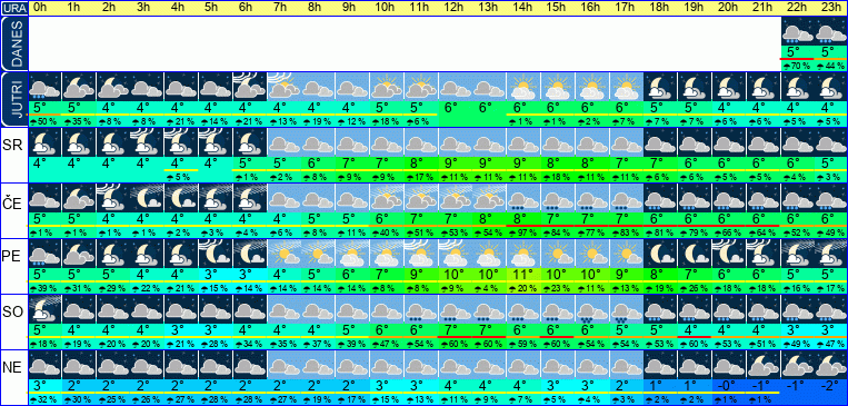 | Ura | 21h | 22h | 23h | | | | | | | | | | | | | | | | | | | | | | |  |  |  | | Temperatura [C°] | 5°C | 5°C | 5°C | | Občutek [C°] | 4°C | 4°C | 3°C | | Možnost padavin | 70 % | 70 % | 44 % | | Količina padavin [mm] | | | | Sneg [cm] | | | | | UV index | | | | | Hitrost vetra | 1 km/h | 1 km/h | 2 km/h | Smer vetra | J | S | S | | Zračni tlak | 1010 | 1010 | 1009 | | Vlaga | 93 % | 93 % | 93 % |