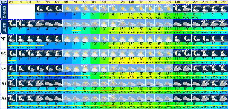 | Ura | 00h | 01h | 02h | 03h | 04h | 05h | 06h | 07h | 08h | 09h | 10h | 11h | 12h | 13h | 14h | 15h | 16h | 17h | 18h | 19h | 20h | 21h | 22h | 23h | |  |  |  |  |  |  |  |  |  |  |  |  |  |  |  |  |  |  |  |  |  |  |  |  | | Temperatura [C°] | 5°C | 4°C | 4°C | 4°C | 4°C | 4°C | 4°C | 5°C | 7°C | 10°C | 13°C | 15°C | 16°C | 16°C | 16°C | 15°C | 14°C | 13°C | 11°C | 10°C | 8°C | 7°C | 6°C | 6°C | | Občutek [C°] | 3°C | 2°C | 2°C | 2°C | 2°C | 1°C | 2°C | 3°C | 5°C | 8°C | 10°C | 11°C | 11°C | 11°C | 11°C | 10°C | 10°C | 9°C | 8°C | 8°C | 7°C | 5°C | 4°C | 4°C | | Možnost padavin | 2 % | | | | | | | | | | | 2 % | 4 % | 11 % | 16 % | 19 % | 34 % | 20 % | 17 % | 14 % | 6 % | 4 % | 3 % | 8 % | | Količina padavin [mm] | | | | | | | | | | | | | | | | | | | | | | | | | Sneg [cm] | | | | | | | | | | | | | | | | | | | | | | | | | | UV index | | | | | | | | | | | UV 1 | UV 1 | UV 2 | UV 2 | UV 2 | UV 2 | UV 1 | | | | | | | | | Hitrost vetra | 2 km/h | 2 km/h | 2 km/h | 2 km/h | 2 km/h | 4 km/h | 2 km/h | 4 km/h | 3 km/h | 6 km/h | 9 km/h | 16 km/h | 16 km/h | 15 km/h | 15 km/h | 15 km/h | 13 km/h | 12 km/h | 11 km/h | 3 km/h | 2 km/h | 3 km/h | 3 km/h | 3 km/h | Smer vetra | Z | Z | Z | Z | Z | Z | S | S | Z | J | J | Z | Z | Z | Z | Z | Z | Z | Z | Z | Z | Z | Z | S | | Zračni tlak | 1012 | 1011 | 1011 | 1010 | 1010 | 1009 | 1009 | 1009 | 1009 | 1009 | 1008 | 1008 | 1007 | 1007 | 1007 | 1007 | 1007 | 1007 | 1008 | 1009 | 1009 | 1010 | 1010 | 1010 | | Vlaga | 91 % | 91 % | 92 % | 92 % | 92 % | 91 % | 92 % | 89 % | 83 % | 70 % | 57 % | 49 % | 45 % | 43 % | 44 % | 46 % | 50 % | 55 % | 62 % | 70 % | 77 % | 81 % | 86 % | 89 % |