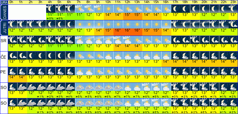 | Ura | 00h | 01h | 02h | 03h | 04h | 05h | 06h | 07h | 08h | 09h | 10h | 11h | 12h | 13h | 14h | 15h | 16h | 17h | 18h | 19h | 20h | 21h | 22h | 23h | |  |  |  |  |  |  |  |  |  |  |  |  |  |  |  |  |  |  |  |  |  |  |  |  | | Temperatura [C°] | 12°C | 12°C | 12°C | 12°C | 12°C | 12°C | 12°C | 12°C | 13°C | 14°C | 15°C | 16°C | 16°C | 16°C | 15°C | 15°C | 14°C | 13°C | 13°C | 12°C | 12°C | 12°C | 12°C | 12°C | | Občutek [C°] | 11°C | 11°C | 11°C | 11°C | 11°C | 11°C | 11°C | 11°C | 12°C | 13°C | 14°C | 15°C | 15°C | 15°C | 15°C | 14°C | 13°C | 12°C | 12°C | 11°C | 11°C | 11°C | 11°C | 11°C | | Možnost padavin | | | | | | | | | | | | | | | | | | | | | | | | | | Količina padavin [mm] | | | | | | | | | | | | | | | | | | | | | | | | | Sneg [cm] | | | | | | | | | | | | | | | | | | | | | | | | | | UV index | | | | | | | | | | | | UV 1 | UV 1 | UV 1 | UV 1 | UV 1 | | | | | | | | | | Hitrost vetra | 9 km/h | 9 km/h | 8 km/h | 7 km/h | 6 km/h | 6 km/h | 5 km/h | 5 km/h | 5 km/h | 4 km/h | 5 km/h | 5 km/h | 5 km/h | 5 km/h | 5 km/h | 5 km/h | 6 km/h | 6 km/h | 6 km/h | 6 km/h | 6 km/h | 6 km/h | 6 km/h | 6 km/h | Smer vetra | S | S | S | S | S | V | J | J | J | J | J | J | J | V | V | Z | S | S | Z | Z | Z | Z | Z | S | | Zračni tlak | 1023 | 1023 | 1023 | 1023 | 1024 | 1024 | 1024 | 1024 | 1024 | 1024 | 1025 | 1024 | 1024 | 1024 | 1024 | 1024 | 1024 | 1024 | 1024 | 1024 | 1024 | 1024 | 1024 | 1023 | | Vlaga | 85 % | 85 % | 87 % | 87 % | 87 % | 87 % | 89 % | 88 % | 86 % | 82 % | 79 % | 76 % | 73 % | 73 % | 76 % | 78 % | 81 % | 83 % | 85 % | 86 % | 85 % | 83 % | 82 % | 83 % |