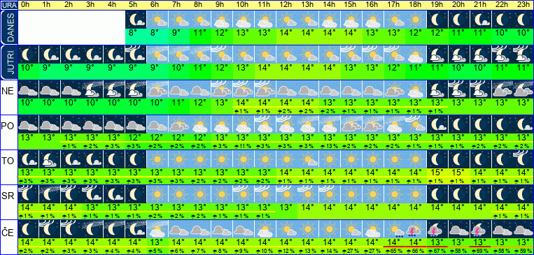 | Ura | | | | | | | | | | | | | | | | | | | | | | | | | | | Temperatura [C°] | | Občutek [C°] | | Možnost padavin | | Količina padavin [mm] | Sneg [cm] | | UV index | | Hitrost vetra | Smer vetra | | Zračni tlak | | Vlaga |
