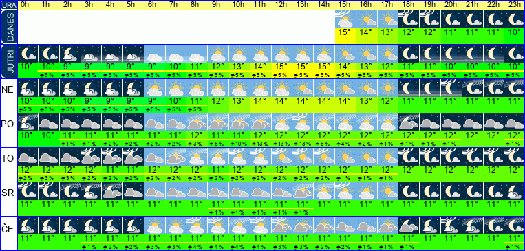 | Ura | 00h | 01h | 02h | 03h | 04h | 05h | 06h | 07h | 08h | 09h | 10h | 11h | 12h | 13h | 14h | 15h | 16h | 17h | 18h | 19h | 20h | 21h | 22h | 23h | |  |  |  |  |  |  |  |  |  |  |  |  |  |  |  |  |  |  |  |  |  |  |  |  | | Temperatura [C°] | 10°C | 10°C | 9°C | 9°C | 9°C | 9°C | 9°C | 10°C | 11°C | 12°C | 13°C | 14°C | 15°C | 15°C | 15°C | 14°C | 13°C | 12°C | 11°C | 11°C | 10°C | 10°C | 10°C | 10°C | | Občutek [C°] | 9°C | 9°C | 8°C | 8°C | 8°C | 8°C | 8°C | 9°C | 10°C | 11°C | 12°C | 13°C | 13°C | 14°C | 14°C | 13°C | 12°C | 11°C | 10°C | 10°C | 9°C | 9°C | 9°C | 9°C | | Možnost padavin | | 5 % | 5 % | 5 % | 5 % | 5 % | 5 % | 5 % | 5 % | 5 % | 5 % | 5 % | 5 % | 5 % | 5 % | 5 % | 5 % | 5 % | 5 % | 5 % | 5 % | 5 % | 5 % | 5 % | | Količina padavin [mm] | | | | | | | | | | | | | | | | | | | | | | | | | Sneg [cm] | | | | | | | | | | | | | | | | | | | | | | | | | | UV index | | | | | | | | | | | UV 1 | UV 2 | UV 2 | UV 3 | UV 2 | UV 2 | UV 1 | | | | | | | | | Hitrost vetra | 4 km/h | 4 km/h | 5 km/h | 5 km/h | 5 km/h | 5 km/h | 5 km/h | 5 km/h | 5 km/h | 5 km/h | 5 km/h | 5 km/h | 4 km/h | 4 km/h | 4 km/h | 4 km/h | 4 km/h | 4 km/h | 4 km/h | 4 km/h | 4 km/h | 4 km/h | 4 km/h | 4 km/h | Smer vetra | S | S | S | V | V | V | V | V | V | V | V | J | V | V | V | V | S | S | V | V | V | V | V | J | | Zračni tlak | 1024 | 1024 | 1024 | 1024 | 1024 | 1024 | 1024 | 1024 | 1025 | 1025 | 1025 | 1025 | 1025 | 1024 | 1024 | 1024 | 1024 | 1024 | 1024 | 1024 | 1024 | 1024 | 1024 | 1025 | | Vlaga | 100 % | 99 % | 100 % | 100 % | 100 % | 100 % | 100 % | 96 % | 89 % | 82 % | 76 % | 73 % | 70 % | 69 % | 70 % | 73 % | 78 % | 83 % | 87 % | 89 % | 90 % | 91 % | 92 % | 93 % |