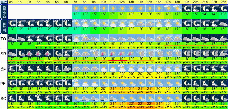 Ura | 00h | 01h | 02h | 03h | 04h | 05h | 06h | 07h | 08h | 09h | 10h | 11h | 12h | 13h | 14h | 15h | 16h | 17h | 18h | 19h | 20h | 21h | 22h | 23h | |  |  |  |  |  |  |  |  |  |  |  |  |  |  |  |  |  |  |  |  |  |  |  |  | Temperatura [C°] | 13°C | 12°C | 12°C | 12°C | 12°C | 12°C | 13°C | 13°C | 13°C | 15°C | 16°C | 17°C | 18°C | 19°C | 19°C | 19°C | 18°C | 18°C | 17°C | 17°C | 16°C | 16°C | 16°C | 16°C | Občutek [C°] | 10°C | 10°C | 10°C | 10°C | 10°C | 10°C | 10°C | 10°C | 11°C | 12°C | 14°C | 15°C | 16°C | 16°C | 16°C | 16°C | 16°C | 16°C | 16°C | 16°C | 15°C | 15°C | 14°C | 14°C | Možnost padavin | | | | | | | | | | | | | | | | | | | | | | | | | Količina padavin [mm] | | | | | | | | | | | | | | | | | | | | | | | | | Sneg [cm] | | | | | | | | | | | | | | | | | | | | | | | | | UV index | | | | | | | | | | | UV 1 | UV 2 | UV 2 | UV 3 | UV 3 | UV 3 | UV 2 | UV 1 | | | | | | | Hitrost vetra | 6 km/h | 7 km/h | 7 km/h | 7 km/h | 7 km/h | 8 km/h | 8 km/h | 9 km/h | 8 km/h | 7 km/h | 7 km/h | 8 km/h | 10 km/h | 12 km/h | 14 km/h | 14 km/h | 14 km/h | 13 km/h | 11 km/h | 10 km/h | 9 km/h | 10 km/h | 11 km/h | 12 km/h | Smer vetra | S | S | S | S | S | S | S | S | S | S | V | V | J | J | J | J | J | J | J | J | V | V | V | V | Zračni tlak | 1019 | 1019 | 1018 | 1018 | 1018 | 1017 | 1017 | 1017 | 1017 | 1017 | 1017 | 1016 | 1016 | 1015 | 1014 | 1014 | 1014 | 1014 | 1014 | 1014 | 1014 | 1013 | 1013 | 1013 | Vlaga | 68 % | 69 % | 68 % | 66 % | 64 % | 63 % | 60 % | 58 % | 54 % | 52 % | 52 % | 49 % | 48 % | 54 % | 57 % | 60 % | 63 % | 67 % | 73 % | 77 % | 80 % | 81 % | 79 % | 77 % |