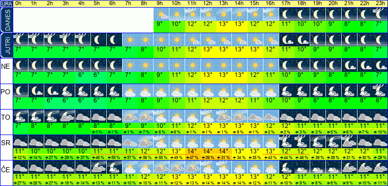 | Dolžina sončnega obsevanja: | 1.9 h (115 minut) | Temp.rosišča: | 9 / 10 / 11 °C | | | Višja, kot je cifra, manjša je verjetnost, | da se napoved spremeni. |