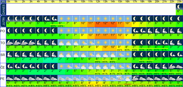 | Temperatura: | 5°C / 8°C / 12°C (+-1°C) | Možnost padavin: | 4 % | Hitrost vetra: | 5 / 6 / 8 km/h (+-3) | Skupna oblačnost: | 0 / 2 / 24 % (+-0) |