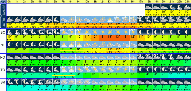 | Ura | 11h | 12h | 13h | 14h | 15h | 16h | 17h | 18h | 19h | 20h | 21h | 22h | 23h | | | | | | | | | | | | |  |  |  |  |  |  |  |  |  |  |  |  |  | | Temperatura [C°] | 10°C | 10°C | 10°C | 10°C | 10°C | 10°C | 10°C | 10°C | 10°C | 11°C | 11°C | 11°C | 11°C | | Občutek [C°] | 9°C | 9°C | 9°C | 9°C | 9°C | 9°C | 9°C | 9°C | 9°C | 10°C | 10°C | 10°C | 10°C | | Možnost padavin | 13 % | 6 % | 6 % | 13 % | 20 % | 26 % | 26 % | 14 % | 21 % | 35 % | 34 % | 33 % | 27 % | | Količina padavin [mm] | | | | | | | | | | | | | | Sneg [cm] | | | | | | | | | | | | | | | UV index | | UV 1 | UV 1 | UV 1 | UV 1 | | | | | | | | | | Hitrost vetra | 4 km/h | 4 km/h | 4 km/h | 4 km/h | 4 km/h | 4 km/h | 4 km/h | 4 km/h | 4 km/h | 4 km/h | 4 km/h | 4 km/h | 4 km/h | Smer vetra | J | J | J | J | J | J | J | V | V | V | V | V | V | | Zračni tlak | 1023 | 1022 | 1022 | 1022 | 1022 | 1021 | 1021 | 1022 | 1022 | 1022 | 1022 | 1022 | 1022 | | Vlaga | 92 % | 91 % | 90 % | 90 % | 91 % | 92 % | 93 % | 93 % | 93 % | 92 % | 92 % | 92 % | 92 % |