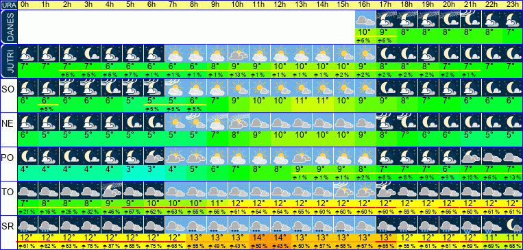 | Ura | 15h | 16h | 17h | 18h | 19h | 20h | 21h | 22h | 23h | | | | | | | | | | | | | | | | |  |  |  |  |  |  |  |  |  | | Temperatura [C°] | 10°C | 10°C | 9°C | 8°C | 8°C | 8°C | 8°C | 8°C | 7°C | | Občutek [C°] | 9°C | 8°C | 8°C | 7°C | 7°C | 6°C | 6°C | 6°C | 6°C | | Možnost padavin | 6 % | 6 % | 6 % | | | | | | | | Količina padavin [mm] | | | | | | | | | | Sneg [cm] | | | | | | | | | | | UV index | UV 1 | | | | | | | | | | Hitrost vetra | 4 km/h | 4 km/h | 4 km/h | 4 km/h | 4 km/h | 4 km/h | 4 km/h | 4 km/h | 4 km/h | Smer vetra | Z | S | S | S | S | S | V | V | V | | Zračni tlak | 996 | 996 | 997 | 997 | 998 | 998 | 999 | 999 | 1000 | | Vlaga | 87 % | 89 % | 91 % | 94 % | 95 % | 95 % | 95 % | 96 % | 96 % |