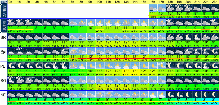 | Ura | 00h | 01h | 02h | 03h | 04h | 05h | 06h | 07h | 08h | 09h | 10h | 11h | 12h | 13h | 14h | 15h | 16h | 17h | 18h | 19h | 20h | 21h | 22h | 23h | |  |  |  |  |  |  |  |  |  |  |  |  |  |  |  |  |  |  |  |  |  |  |  |  | | Temperatura [C°] | 9°C | 9°C | 8°C | 8°C | 8°C | 8°C | 8°C | 8°C | 9°C | 10°C | 11°C | 11°C | 11°C | 11°C | 11°C | 11°C | 10°C | 10°C | 9°C | 9°C | 9°C | 9°C | 9°C | 10°C | | Občutek [C°] | 7°C | 7°C | 7°C | 7°C | 6°C | 6°C | 6°C | 7°C | 7°C | 9°C | 9°C | 10°C | 10°C | 10°C | 10°C | 9°C | 9°C | 9°C | 8°C | 8°C | 8°C | 8°C | 8°C | 8°C | | Možnost padavin | 1 % | 6 % | 1 % | 1 % | | | | | | | 5 % | | | 1 % | 1 % | 2 % | 2 % | 7 % | 8 % | 9 % | 26 % | 39 % | 55 % | 22 % | | Količina padavin [mm] | | | | | | | | | | | | | | | | | | | | | | 1 mm | 1 mm | | Sneg [cm] | | | | | | | | | | | | | | | | | | | | | | | | | | UV index | | | | | | | | | | | | UV 1 | UV 1 | UV 1 | UV 1 | UV 1 | UV 1 | | | | | | | | | Hitrost vetra | 4 km/h | 4 km/h | 4 km/h | 4 km/h | 4 km/h | 4 km/h | 4 km/h | 4 km/h | 4 km/h | 3 km/h | 4 km/h | 4 km/h | 5 km/h | 5 km/h | 5 km/h | 5 km/h | 4 km/h | 4 km/h | 4 km/h | 4 km/h | 5 km/h | 5 km/h | 6 km/h | 7 km/h | Smer vetra | V | V | V | V | V | V | V | V | V | V | J | J | J | Z | J | J | J | J | J | J | J | J | J | J | | Zračni tlak | 1008 | 1008 | 1008 | 1007 | 1007 | 1007 | 1007 | 1007 | 1007 | 1007 | 1007 | 1007 | 1007 | 1007 | 1006 | 1006 | 1005 | 1005 | 1005 | 1005 | 1005 | 1005 | 1005 | 1005 | | Vlaga | 91 % | 92 % | 93 % | 92 % | 92 % | 92 % | 91 % | 89 % | 88 % | 88 % | 85 % | 84 % | 84 % | 85 % | 85 % | 86 % | 88 % | 89 % | 91 % | 92 % | 93 % | 94 % | 95 % | 94 % |