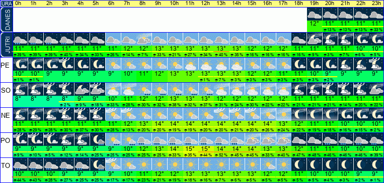 | Ura | 00h | 01h | 02h | 03h | 04h | 05h | 06h | 07h | 08h | 09h | 10h | 11h | 12h | 13h | 14h | 15h | 16h | 17h | 18h | 19h | 20h | 21h | 22h | 23h | |  |  |  |  |  |  |  |  |  |  |  |  |  |  |  |  |  |  |  |  |  |  |  |  | | Temperatura [C°] | 10°C | 10°C | 10°C | 10°C | 9°C | 9°C | 9°C | 10°C | 11°C | 12°C | 12°C | 13°C | 13°C | 13°C | 13°C | 13°C | 13°C | 12°C | 11°C | 11°C | 10°C | 9°C | 9°C | 9°C | | Občutek [C°] | 7°C | 7°C | 7°C | 6°C | 6°C | 6°C | 6°C | 7°C | 8°C | 9°C | 9°C | 9°C | 10°C | 10°C | 10°C | 10°C | 10°C | 9°C | 8°C | 8°C | 7°C | 6°C | 6°C | 6°C | | Možnost padavin | 47 % | 46 % | 30 % | 29 % | 25 % | 25 % | 19 % | 18 % | 23 % | 22 % | 20 % | 18 % | 16 % | 8 % | 7 % | 7 % | 7 % | 8 % | 9 % | 9 % | 8 % | 6 % | 5 % | 4 % | | Količina padavin [mm] | | | | | | | | | | | | | | | | | | | | | | | | | Sneg [cm] | | | | | | | | | | | | | | | | | | | | | | | | | | UV index | | | | | | | | | | | UV 1 | UV 2 | UV 3 | UV 3 | UV 3 | UV 2 | UV 1 | UV 1 | | | | | | | | Hitrost vetra | 11 km/h | 11 km/h | 12 km/h | 11 km/h | 10 km/h | 10 km/h | 9 km/h | 9 km/h | 10 km/h | 11 km/h | 11 km/h | 12 km/h | 12 km/h | 12 km/h | 12 km/h | 12 km/h | 11 km/h | 10 km/h | 9 km/h | 8 km/h | 8 km/h | 9 km/h | 9 km/h | 9 km/h | Smer vetra | S | V | S | S | S | S | S | S | S | V | V | V | V | V | V | V | V | V | V | V | V | V | S | V | | Zračni tlak | 1014 | 1014 | 1015 | 1015 | 1015 | 1015 | 1016 | 1016 | 1017 | 1017 | 1018 | 1017 | 1017 | 1017 | 1017 | 1016 | 1016 | 1016 | 1017 | 1017 | 1017 | 1018 | 1018 | 1018 | | Vlaga | 84 % | 83 % | 79 % | 77 % | 76 % | 74 % | 73 % | 71 % | 69 % | 64 % | 61 % | 59 % | 58 % | 57 % | 57 % | 57 % | 58 % | 60 % | 62 % | 65 % | 68 % | 70 % | 72 % | 73 % |
