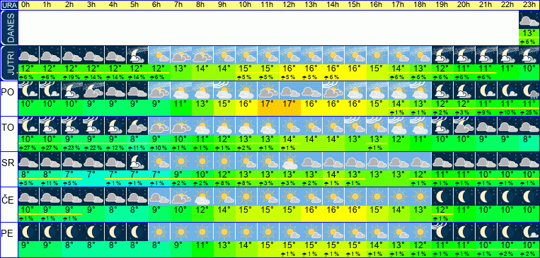 | Ura | 00h | 01h | 02h | 03h | 04h | 05h | 06h | 07h | 08h | 09h | 10h | 11h | 12h | 13h | 14h | 15h | 16h | 17h | 18h | 19h | 20h | 21h | 22h | 23h | |  |  |  |  |  |  |  |  |  |  |  |  |  |  |  |  |  |  |  |  |  |  |  |  | | Temperatura [C°] | 10°C | 10°C | 10°C | 9°C | 9°C | 9°C | 9°C | 11°C | 13°C | 15°C | 16°C | 17°C | 16°C | 16°C | 16°C | 16°C | 15°C | 14°C | 13°C | 12°C | 12°C | 11°C | 11°C | 10°C | | Občutek [C°] | 8°C | 8°C | 8°C | 7°C | 7°C | 7°C | 7°C | 9°C | 11°C | 14°C | 15°C | 15°C | 16°C | 15°C | 15°C | 14°C | 14°C | 13°C | 12°C | 11°C | 10°C | 9°C | 9°C | 8°C | | Možnost padavin | 1 % | | | | | | | | | | | | | 1 % | 1 % | 2 % | 2 % | 3 % | 4 % | 5 % | 5 % | 24 % | 24 % | 46 % | | Količina padavin [mm] | | | | | | | | | | | | | | | | | | | | | | | | | Sneg [cm] | | | | | | | | | | | | | | | | | | | | | | | | | | UV index | | | | | | | | | | | UV 1 | UV 2 | UV 2 | UV 3 | UV 3 | UV 2 | UV 1 | UV 1 | | | | | | | | Hitrost vetra | 6 km/h | 6 km/h | 6 km/h | 6 km/h | 6 km/h | 6 km/h | 6 km/h | 6 km/h | 5 km/h | 4 km/h | 4 km/h | 5 km/h | 6 km/h | 6 km/h | 6 km/h | 6 km/h | 5 km/h | 5 km/h | 4 km/h | 5 km/h | 6 km/h | 6 km/h | 8 km/h | 10 km/h | Smer vetra | V | S | V | V | V | V | V | V | V | J | Z | Z | Z | Z | Z | S | Z | S | S | S | S | S | S | S | | Zračni tlak | 1012 | 1012 | 1012 | 1012 | 1012 | 1012 | 1012 | 1012 | 1013 | 1013 | 1013 | 1013 | 1013 | 1013 | 1013 | 1013 | 1012 | 1013 | 1013 | 1013 | 1014 | 1014 | 1014 | 1014 | | Vlaga | 81 % | 81 % | 81 % | 81 % | 80 % | 81 % | 80 % | 77 % | 72 % | 65 % | 61 % | 62 % | 64 % | 65 % | 65 % | 66 % | 68 % | 70 % | 74 % | 76 % | 78 % | 79 % | 78 % | 77 % |