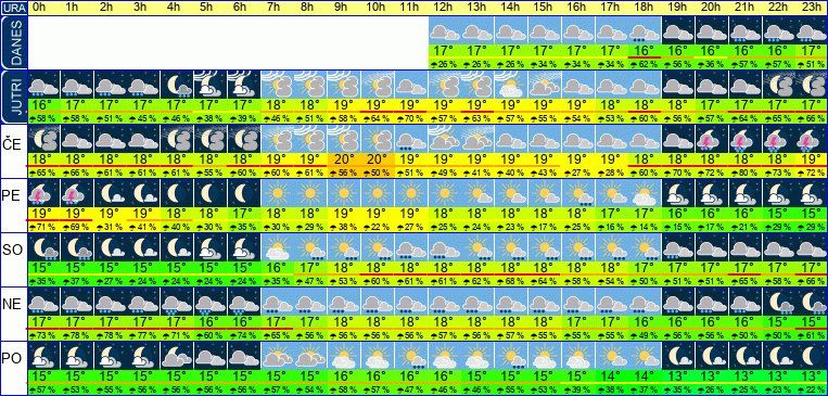 Ura | 00h | 01h | 02h | 03h | 04h | 05h | 06h | 07h | 08h | 09h | 10h | 11h | 12h | 13h | 14h | 15h | 16h | 17h | 18h | 19h | 20h | 21h | 22h | 23h | |  |  |  |  |  |  |  |  |  |  |  |  |  |  |  |  |  |  |  |  |  |  |  |  | Temperatura [C°] | 17°C | 17°C | 17°C | 17°C | 16°C | 16°C | 16°C | 16°C | 17°C | 17°C | 18°C | 18°C | 18°C | 19°C | 19°C | 19°C | 19°C | 18°C | 18°C | 17°C | 17°C | 17°C | 17°C | 17°C | Občutek [C°] | 16°C | 16°C | 16°C | 15°C | 15°C | 15°C | 15°C | 15°C | 16°C | 16°C | 17°C | 17°C | 17°C | 17°C | 18°C | 18°C | 18°C | 18°C | 17°C | 17°C | 16°C | 16°C | 16°C | 16°C | Možnost padavin | 34 % | 36 % | 37 % | 41 % | 43 % | 37 % | 38 % | 40 % | 34 % | 41 % | 34 % | 34 % | 34 % | 27 % | 30 % | 33 % | 33 % | 47 % | 66 % | 66 % | 67 % | 68 % | 70 % | 71 % | Količina padavin [mm] | | | | | | | | | | | | | | 1 mm | 1 mm | 1 mm | | | | | | | | | Sneg [cm] | | | | | | | | | | | | | | | | | | | | | | | | | UV index | | | | | | | | | | | | UV 1 | | UV 1 | UV 1 | UV 1 | UV 1 | | | | | | | | Hitrost vetra | 12 km/h | 11 km/h | 11 km/h | 11 km/h | 11 km/h | 12 km/h | 11 km/h | 11 km/h | 10 km/h | 11 km/h | 12 km/h | 13 km/h | 15 km/h | 16 km/h | 17 km/h | 17 km/h | 15 km/h | 15 km/h | 15 km/h | 15 km/h | 15 km/h | 14 km/h | 14 km/h | 13 km/h | Smer vetra | J | J | V | V | V | V | V | V | J | J | J | J | J | J | J | J | J | J | J | J | J | V | V | J | Zračni tlak | 1011 | 1011 | 1011 | 1011 | 1011 | 1011 | 1011 | 1011 | 1011 | 1011 | 1012 | 1012 | 1012 | 1011 | 1011 | 1011 | 1010 | 1010 | 1010 | 1010 | 1010 | 1010 | 1010 | 1010 | Vlaga | 76 % | 77 % | 76 % | 78 % | 79 % | 79 % | 80 % | 78 % | 83 % | 82 % | 79 % | 79 % | 82 % | 81 % | 80 % | 81 % | 83 % | 90 % | 94 % | 94 % | 92 % | 89 % | 87 % | 84 % |
