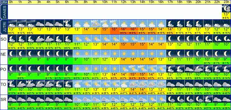 | Ura | 00h | 01h | 02h | 03h | 04h | 05h | 06h | 07h | 08h | 09h | 10h | 11h | 12h | 13h | 14h | 15h | 16h | 17h | 18h | 19h | 20h | 21h | 22h | 23h | |  |  |  |  |  |  |  |  |  |  |  |  |  |  |  |  |  |  |  |  |  |  |  |  | | Temperatura [C°] | 9°C | 10°C | 10°C | 10°C | 10°C | 10°C | 11°C | 11°C | 12°C | 13°C | 13°C | 13°C | 13°C | 14°C | 14°C | 13°C | 13°C | 12°C | 11°C | 11°C | 10°C | 10°C | 10°C | 10°C | | Občutek [C°] | 6°C | 6°C | 6°C | 6°C | 6°C | 6°C | 7°C | 7°C | 8°C | 9°C | 9°C | 10°C | 10°C | 10°C | 10°C | 10°C | 9°C | 8°C | 8°C | 7°C | 7°C | 6°C | 6°C | 6°C | | Možnost padavin | 13 % | 20 % | 21 % | 16 % | 12 % | 18 % | 18 % | 18 % | 20 % | 26 % | 28 % | 35 % | 47 % | 41 % | 46 % | 48 % | 43 % | 36 % | 28 % | 21 % | 28 % | 29 % | 29 % | 42 % | | Količina padavin [mm] | | | | | | | | | | | | | | | | | | | | | | | | | Sneg [cm] | | | | | | | | | | | | | | | | | | | | | | | | | | UV index | | | | | | | | | | | | | | | | | | | | | | | | | | Hitrost vetra | 14 km/h | 14 km/h | 15 km/h | 16 km/h | 17 km/h | 17 km/h | 17 km/h | 17 km/h | 17 km/h | 18 km/h | 18 km/h | 18 km/h | 18 km/h | 18 km/h | 17 km/h | 17 km/h | 16 km/h | 15 km/h | 15 km/h | 15 km/h | 15 km/h | 15 km/h | 15 km/h | 15 km/h | Smer vetra | V | V | V | V | V | V | V | V | V | V | V | V | V | V | V | V | V | V | V | V | V | V | V | V | | Zračni tlak | 1014 | 1014 | 1014 | 1013 | 1013 | 1013 | 1013 | 1013 | 1013 | 1013 | 1013 | 1013 | 1012 | 1012 | 1012 | 1012 | 1012 | 1012 | 1012 | 1012 | 1012 | 1012 | 1012 | 1012 | | Vlaga | 82 % | 81 % | 80 % | 79 % | 78 % | 77 % | 77 % | 77 % | 77 % | 75 % | 75 % | 76 % | 77 % | 75 % | 73 % | 73 % | 73 % | 74 % | 76 % | 77 % | 78 % | 78 % | 79 % | 80 % |