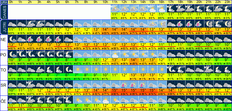 | Ura | 00h | 01h | 02h | 03h | 04h | 05h | 06h | 07h | 08h | 09h | 10h | 11h | 12h | 13h | 14h | 15h | 16h | 17h | 18h | 19h | 20h | 21h | 22h | 23h | |  |  |  |  |  |  |  |  |  |  |  |  |  |  |  |  |  |  |  |  |  |  |  |  | | Temperatura [C°] | 13°C | 13°C | 13°C | 13°C | 13°C | 13°C | 12°C | 12°C | 12°C | 13°C | 13°C | 13°C | 13°C | 14°C | 13°C | 13°C | 12°C | 11°C | 11°C | 11°C | 11°C | 11°C | 11°C | 10°C | | Občutek [C°] | 9°C | 9°C | 9°C | 9°C | 9°C | 9°C | 10°C | 10°C | 10°C | 11°C | 11°C | 11°C | 11°C | 11°C | 11°C | 10°C | 9°C | 8°C | 7°C | 7°C | 7°C | 7°C | 7°C | 7°C | | Možnost padavin | 64 % | 64 % | 79 % | 71 % | 72 % | 80 % | 87 % | 72 % | 71 % | 74 % | 81 % | 58 % | 58 % | 50 % | 48 % | 40 % | 41 % | 48 % | 47 % | 54 % | 52 % | 66 % | 55 % | 55 % | | Količina padavin [mm] | 1 mm | 2 mm | 1 mm | | 1 mm | 1 mm | 1 mm | | 1 mm | 1 mm | | | | | | | | | | 1 mm | 3 mm | 2 mm | 2 mm | 2 mm | Sneg [cm] | | | | | | | | | | | | | | | | | | | | | | | | | | UV index | | | | | | | | | | | | | UV 1 | UV 1 | UV 1 | UV 1 | | | | | | | | | | Hitrost vetra | 22 km/h | 23 km/h | 22 km/h | 19 km/h | 17 km/h | 16 km/h | 15 km/h | 13 km/h | 11 km/h | 10 km/h | 9 km/h | 9 km/h | 9 km/h | 11 km/h | 12 km/h | 13 km/h | 13 km/h | 14 km/h | 15 km/h | 16 km/h | 16 km/h | 16 km/h | 15 km/h | 14 km/h | Smer vetra | V | V | V | V | V | J | V | V | V | V | V | V | V | V | J | J | J | J | V | V | V | V | J | J | | Zračni tlak | 1004 | 1003 | 1003 | 1003 | 1002 | 1002 | 1001 | 1001 | 1001 | 1000 | 1000 | 1000 | 1000 | 1000 | 1000 | 999 | 999 | 999 | 999 | 1000 | 1000 | 999 | 999 | 999 | | Vlaga | 78 % | 79 % | 79 % | 81 % | 83 % | 84 % | 84 % | 83 % | 79 % | 75 % | 72 % | 72 % | 72 % | 70 % | 68 % | 69 % | 70 % | 73 % | 75 % | 75 % | 75 % | 74 % | 76 % | 77 % |