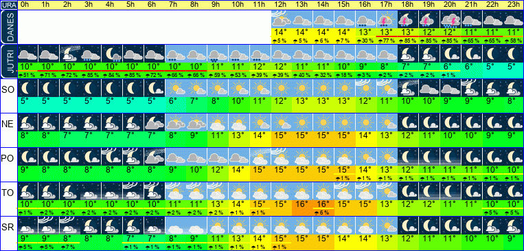 | Temperatura: | 10°C / 12°C / 15°C (+-2°C) | Možnost padavin: | 61 % | Hitrost vetra: | 8 / 11 / 13 km/h (+-20) | Skupna oblačnost: | 28 / 43 / 100 % (+-40) |