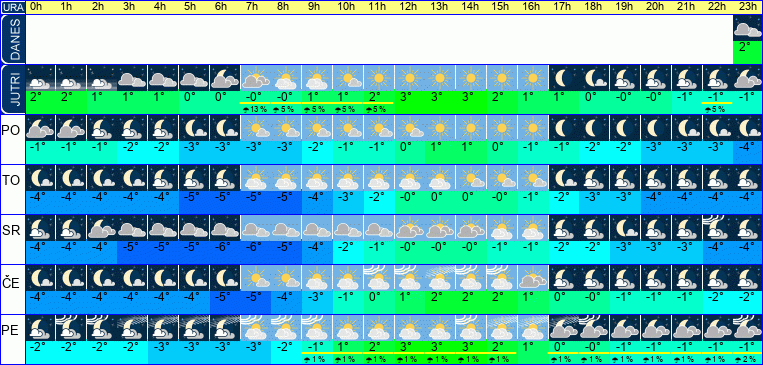 | Ura | 00h | 01h | 02h | 03h | 04h | 05h | 06h | 07h | 08h | 09h | 10h | 11h | 12h | 13h | 14h | 15h | 16h | 17h | 18h | 19h | 20h | 21h | 22h | 23h | |  |  |  |  |  |  |  |  |  |  |  |  |  |  |  |  |  |  |  |  |  |  |  |  | | Temperatura [C°] | -2°C | -2°C | -2°C | -3°C | -3°C | -3°C | -3°C | -3°C | -2°C | -1°C | 0°C | 2°C | 2°C | 3°C | 3°C | 2°C | 1°C | 1°C | 0°C | -0°C | -1°C | -1°C | -1°C | -1°C | | Občutek [C°] | -5°C | -5°C | -6°C | -6°C | -6°C | -6°C | -6°C | -6°C | -5°C | -4°C | -2°C | -1°C | -1°C | -0°C | -0°C | -1°C | -2°C | -2°C | -3°C | -3°C | -3°C | -4°C | -4°C | -4°C | | Možnost padavin | 8 % | 8 % | 1 % | 8 % | 8 % | 1 % | 8 % | 8 % | 8 % | 8 % | 7 % | 8 % | 8 % | 2 % | 2 % | 2 % | 13 % | 13 % | 13 % | 22 % | 23 % | 25 % | 25 % | 24 % | | Količina padavin [mm] | | | | | | | | | | | | | | | | | | | | | | 1 mm | 1 mm | | Sneg [cm] | | | | | | | | | | | | | | | | | | | | | | 0.8 cm | 0.8 cm | | | UV index | | | | | | | | | | | | | UV 1 | UV 1 | UV 1 | | | | | | | | | | | Hitrost vetra | 1 km/h | 1 km/h | 2 km/h | 2 km/h | 2 km/h | 2 km/h | 2 km/h | 2 km/h | 1 km/h | 1 km/h | 1 km/h | 1 km/h | 2 km/h | 2 km/h | 2 km/h | 3 km/h | 3 km/h | 2 km/h | 2 km/h | 2 km/h | 2 km/h | 2 km/h | 2 km/h | 2 km/h | Smer vetra | Z | Z | Z | Z | Z | Z | Z | Z | Z | Z | V | V | V | V | V | V | V | V | V | V | V | V | V | V | | Zračni tlak | 1009 | 1009 | 1009 | 1009 | 1009 | 1009 | 1009 | 1009 | 1009 | 1008 | 1008 | 1008 | 1007 | 1007 | 1007 | 1007 | 1007 | 1007 | 1007 | 1007 | 1008 | 1008 | 1008 | 1008 | | Vlaga | 80 % | 84 % | 81 % | 83 % | 83 % | 83 % | 84 % | 84 % | 83 % | 80 % | 72 % | 68 % | 66 % | 65 % | 66 % | 69 % | 76 % | 79 % | 83 % | 86 % | 88 % | 89 % | 90 % | 91 % |