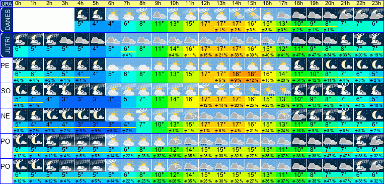 | Ura | 00h | 01h | 02h | 03h | 04h | 05h | 06h | 07h | 08h | 09h | 10h | 11h | 12h | 13h | 14h | 15h | 16h | 17h | 18h | 19h | 20h | 21h | 22h | 23h | |  |  |  |  |  |  |  |  |  |  |  |  |  |  |  |  |  |  |  |  |  |  |  |  | | Temperatura [C°] | 6°C | 5°C | 5°C | 5°C | 5°C | 5°C | 5°C | 6°C | 8°C | 10°C | 12°C | 14°C | 15°C | 15°C | 15°C | 15°C | 13°C | 11°C | 10°C | 8°C | 7°C | 7°C | 6°C | 6°C | | Občutek [C°] | 4°C | 4°C | 3°C | 3°C | 3°C | 3°C | 3°C | 4°C | 6°C | 8°C | 11°C | 12°C | 13°C | 13°C | 13°C | 12°C | 11°C | 9°C | 8°C | 6°C | 5°C | 4°C | 4°C | 3°C | | Možnost padavin | 12 % | 11 % | 12 % | 4 % | 5 % | 5 % | 14 % | 22 % | 23 % | 32 % | 26 % | 35 % | 25 % | 30 % | 32 % | 27 % | 36 % | 37 % | 38 % | 38 % | 47 % | 47 % | 38 % | 32 % | | Količina padavin [mm] | | | | | | | | | | | | 1 mm | 1 mm | 2 mm | | | | | | | 1 mm | | | | Sneg [cm] | | | | | | | | | | | | | | | | | | | | | | | | | | UV index | | | | | | | | | | | UV 1 | UV 2 | UV 2 | UV 3 | UV 2 | UV 2 | UV 1 | UV 1 | | | | | | | | Hitrost vetra | 2 km/h | 2 km/h | 2 km/h | 2 km/h | 2 km/h | 2 km/h | 2 km/h | 2 km/h | 3 km/h | 3 km/h | 3 km/h | 4 km/h | 4 km/h | 4 km/h | 4 km/h | 4 km/h | 4 km/h | 4 km/h | 3 km/h | 3 km/h | 3 km/h | 3 km/h | 3 km/h | 3 km/h | Smer vetra | V | Z | Z | S | S | S | S | S | Z | Z | Z | Z | S | S | S | J | J | J | J | J | Z | Z | Z | Z | | Zračni tlak | 1014 | 1014 | 1014 | 1013 | 1013 | 1013 | 1012 | 1012 | 1012 | 1011 | 1011 | 1011 | 1012 | 1012 | 1013 | 1014 | 1015 | 1015 | 1016 | 1017 | 1017 | 1018 | 1018 | 1019 | | Vlaga | 90 % | 92 % | 91 % | 91 % | 90 % | 91 % | 89 % | 86 % | 80 % | 71 % | 60 % | 53 % | 49 % | 46 % | 44 % | 45 % | 49 % | 57 % | 63 % | 68 % | 72 % | 75 % | 77 % | 78 % |