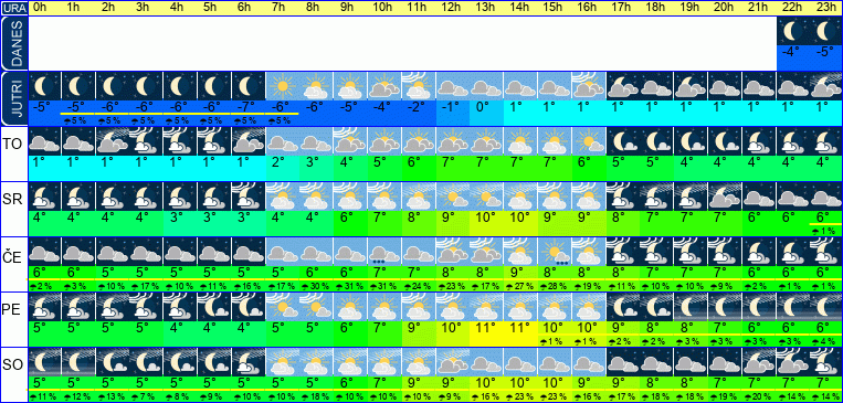 | Ura | 00h | 01h | 02h | 03h | 04h | 05h | 06h | 07h | 08h | 09h | 10h | 11h | 12h | 13h | 14h | 15h | 16h | 17h | 18h | 19h | 20h | 21h | 22h | 23h | |  |  |  |  |  |  |  |  |  |  |  |  |  |  |  |  |  |  |  |  |  |  |  |  | | Temperatura [C°] | -0°C | -1°C | -2°C | -3°C | -4°C | -5°C | -6°C | -6°C | -6°C | -5°C | -4°C | -2°C | -2°C | -1°C | -1°C | -2°C | -3°C | -4°C | -5°C | -6°C | -6°C | -7°C | -7°C | -7°C | | Občutek [C°] | -4°C | -6°C | -7°C | -8°C | -9°C | -9°C | -10°C | -10°C | -10°C | -9°C | -8°C | -7°C | -6°C | -5°C | -6°C | -6°C | -7°C | -8°C | -9°C | -10°C | -10°C | -11°C | -11°C | -11°C | | Možnost padavin | 6 % | 6 % | 14 % | | | | | | | | | | | 5 % | | | | | | | | | | | | Količina padavin [mm] | | | | | | | | | | | | | | | | | | | | | | | | | Sneg [cm] | | | | | | | | | | | | | | | | | | | | | | | | | | UV index | | | | | | | | | | | | UV 1 | UV 1 | UV 1 | UV 1 | UV 1 | | | | | | | | | | Hitrost vetra | 9 km/h | 9 km/h | 9 km/h | 8 km/h | 6 km/h | 5 km/h | 5 km/h | 4 km/h | 4 km/h | 5 km/h | 5 km/h | 6 km/h | 7 km/h | 7 km/h | 6 km/h | 6 km/h | 6 km/h | 6 km/h | 6 km/h | 6 km/h | 5 km/h | 5 km/h | 5 km/h | 5 km/h | Smer vetra | S | S | V | V | S | S | S | Z | Z | Z | Z | Z | Z | Z | Z | Z | Z | Z | Z | S | S | Z | Z | Z | | Zračni tlak | 1011 | 1013 | 1014 | 1015 | 1016 | 1018 | 1019 | 1020 | 1021 | 1022 | 1023 | 1022 | 1022 | 1022 | 1022 | 1023 | 1023 | 1024 | 1024 | 1025 | 1025 | 1025 | 1026 | 1026 | | Vlaga | 83 % | 77 % | 75 % | 75 % | 75 % | 76 % | 75 % | 76 % | 76 % | 77 % | 75 % | 72 % | 70 % | 70 % | 70 % | 73 % | 76 % | 80 % | 80 % | 82 % | 82 % | 81 % | 80 % | 83 % |